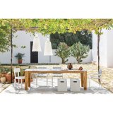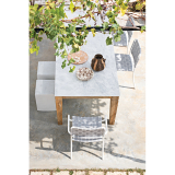 La table Jeko 33 a été créée par Paola Navone pour la marque Gervasoni. De style colonial et d’inspiration exotique, la table Jeko 33 possède un piétement en éco-teck. Conçu pour résister à l’eau et au soleil, ce matériau provient de la valorisation de poutres et d’éléments de récupération en teck, qui sont réparés avec du bois recyclé, assemblés puis polis afin de mettre en valeur les veines d’origine du bois. Avec son plateau en marbre blanc de Carrare, la table Jeko 33 forme un produit qui joue sur les contrastes visuels entre les deux matériaux.