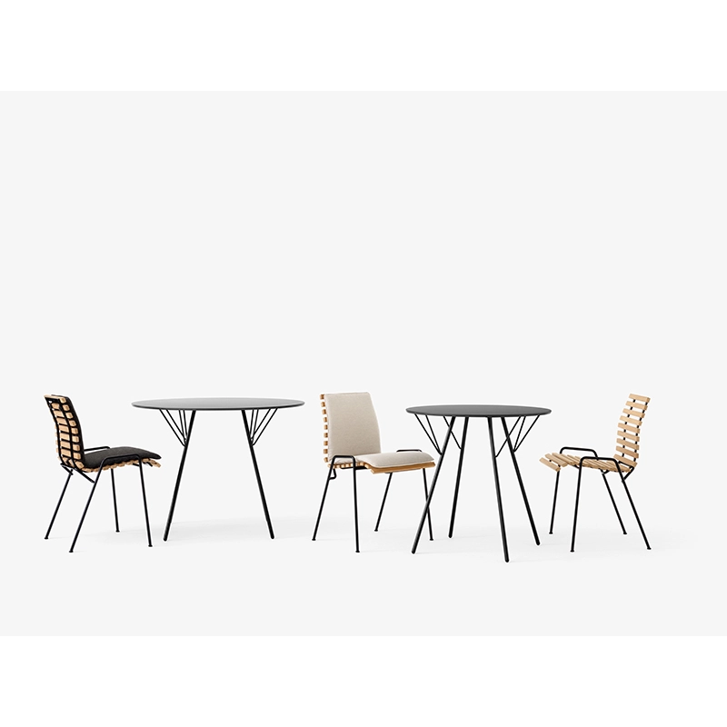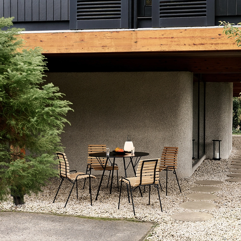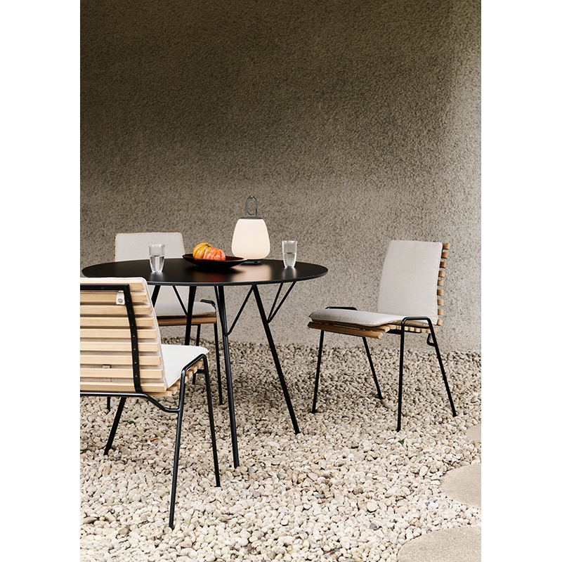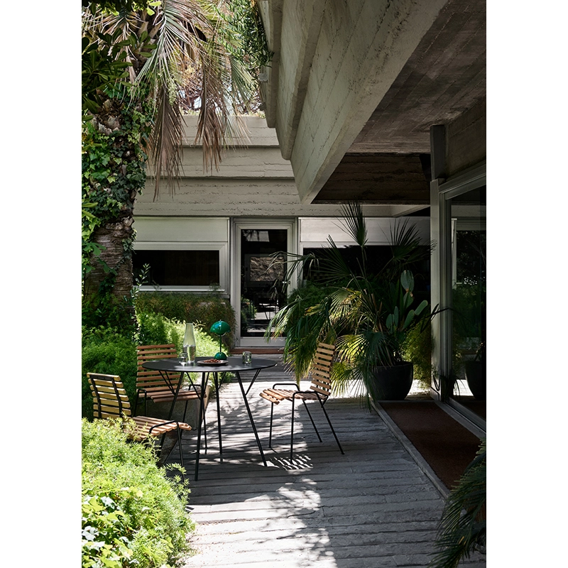 Dessinée par Robin Day, RFH est une collection conçue en 1951 pour meubler le Royal Festival Hall à Londres. And Tradition a collaboré étroitement avec la Fondation Robin et Lucienne Day pour rééditer des modèles emblématiques pour la première fois depuis des décennies. Conçue pour aller avec la chaise RFH RD4, la table RHF est fabriquée en acier noir revêtu de poudre et dotée d'un plateau en stratifié. Ainsi, cette table d’extérieur est particulièrement résistante à l'usure, à la décoloration et à l'eau. La finition de la table RFH donne une surface légèrement mate, tout en garantissant un nettoyage et un entretien faciles. Disponible en deux diamètres, la table RFH est visuellement légère grâce à ses pieds fins inclinés, tout en étant robuste par ses matériaux et ses renforts métalliques. Avec son aspect industriel doux, la table RFH de And Tradition trouve sa place sur toutes les terrasses et dans tous les jardins.