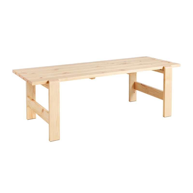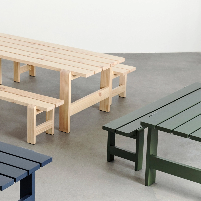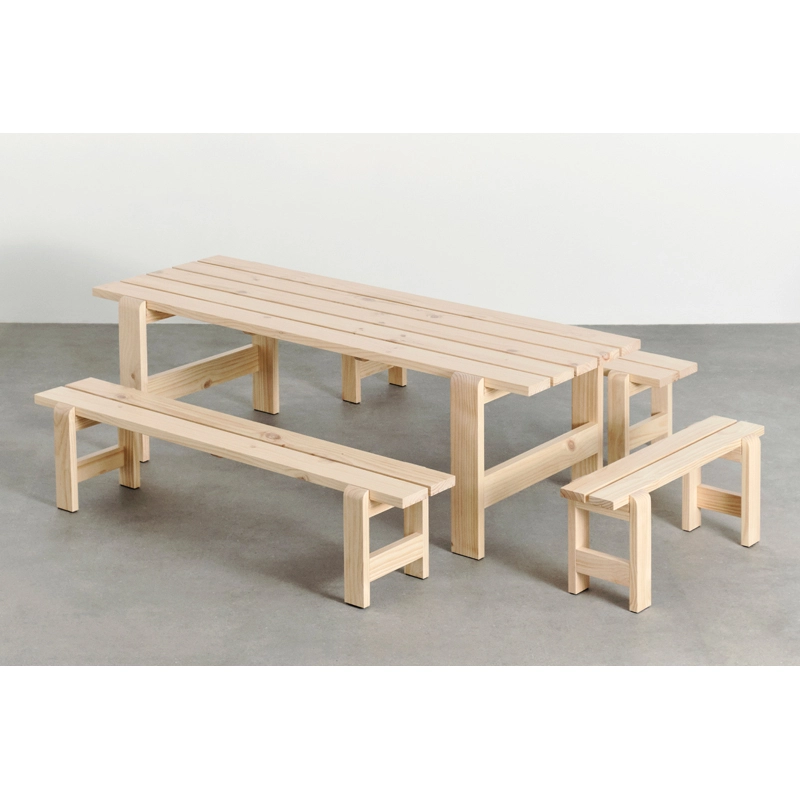 Conçue par les designers Hannes & Fritz pour Hay, Weekday est une collection de bancs et de tables d'extérieur. Inspiré par l'idée de rassembler les gens, la table Weekday combine une présence robuste et massive avec des articulations doucement arrondies, apportant une sensation chaleureuse et familière, qui invite à partager un repas dans une atmosphère conviviale. La collection Weekday est fabriquée bois de pin massif qui prendra une belle patine avec le temps et durera de nombreuses années. Le caractère à la fois robuste et universel de la collection Weekday, combiné à ses différentes options de tailles et à son traitement à base d'eau résistant aux intempéries, en fait un produit adapté à une utilisation en extérieur.