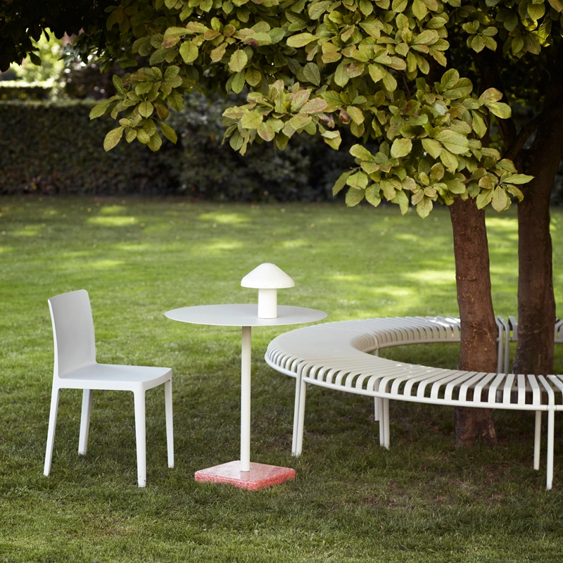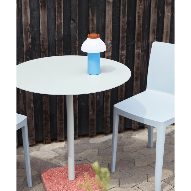Terrazzo Ø 70 se décline avec un plateau rond ou carré, réalisé en acier électro-zingué avec une finition époxy, pour une meilleure résistance. La base est en terrazzo poli, un matériau choisi pour son aspect durable, mais aussi pour sa finition unique et distincte qui crée un contraste avec la simplicité du plateau. Conçue pour être utilisée dans un jardin, une terrasse ou un balcon, la