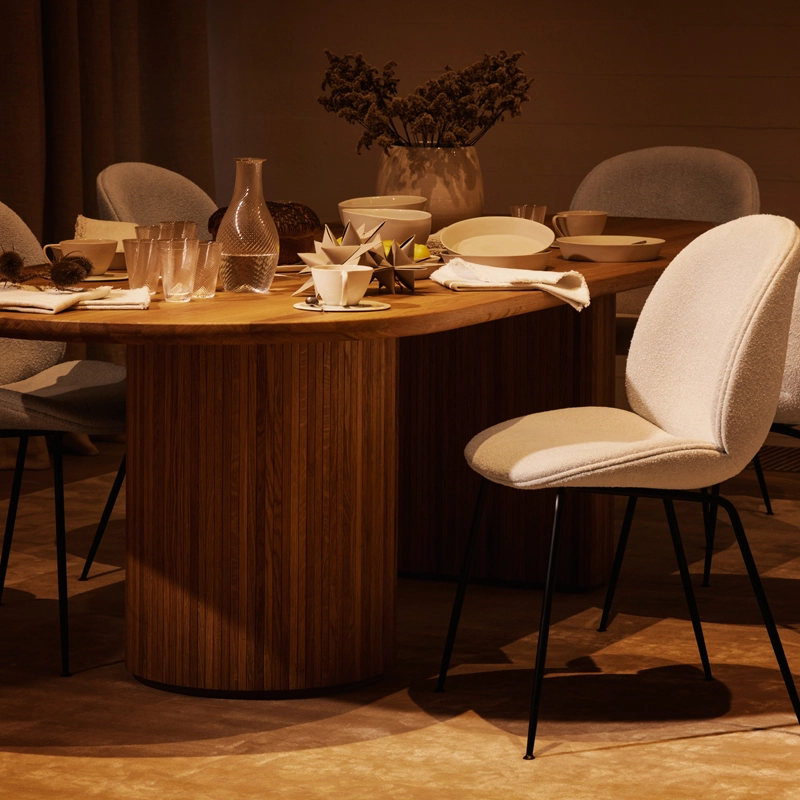 Avec Moon, le studio de design Space Copenhagen a conçu pour Gubi une collection de tables au formes organiques conçue aussi bien pour les espaces domestiques que publics. Le magnifique plateau de la table en chêne est fixé sur une base en forme de demi-lune ou de pleine lune, dotée d'une surface biseautée, servant de structure et d'ornement. L'interaction entre ces deux éléments donne à la table Moon une identité simple mais forte pour le design. Le résultat est une table élégante avec des références claires à la menuiserie traditionnelle danoise, où l'hommage au mariage entre le design et l'artisanat est mis en avant.