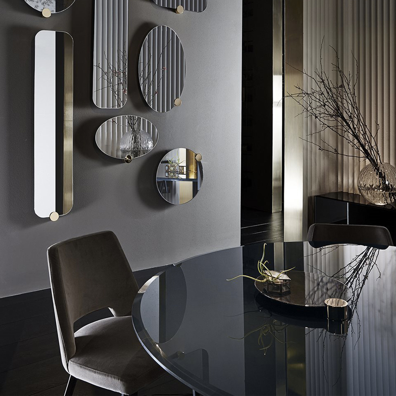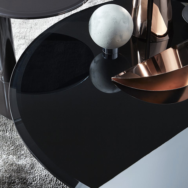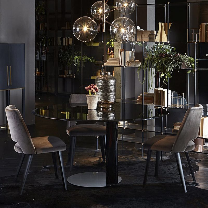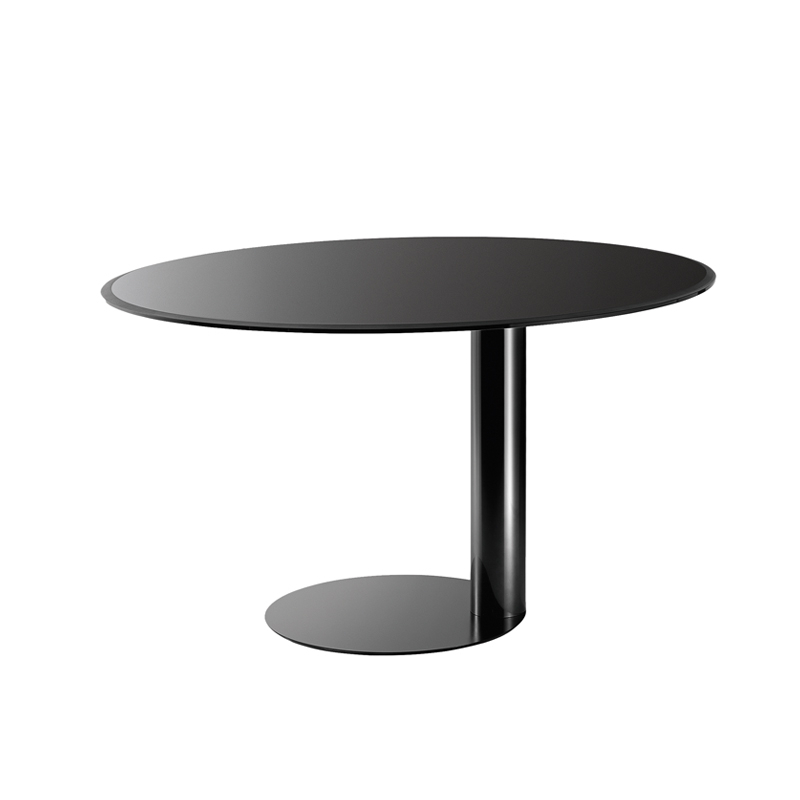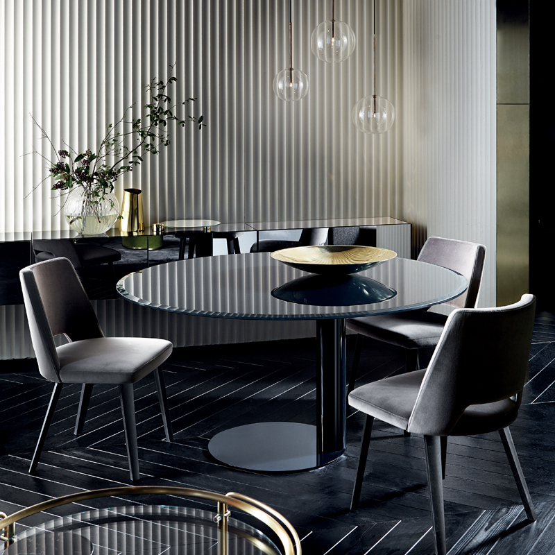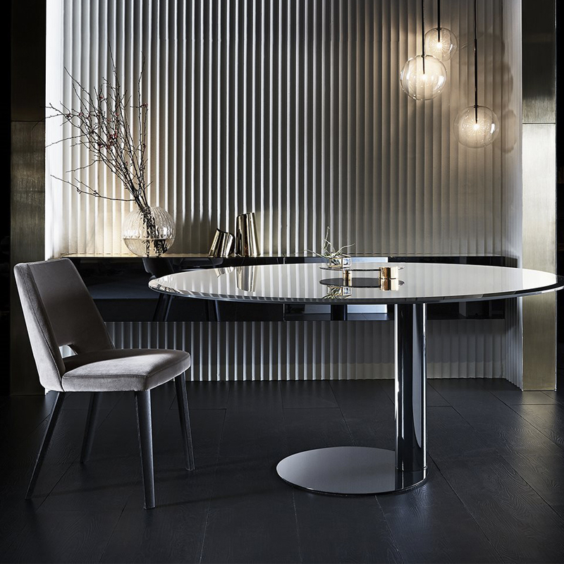 Oto est une table de repas ronde au design sculptural. Composée de formes géométriques essentielles, elle trouve son originalité dans son pied décentré qui donne une sensation visuelle de fragile équilibre. Néanmoins, sa conception et les matériaux utilisés en font une table parfaitement équilibrée et robuste. Elle est dotée d'un plateau en verre biseauté de 15 mm et verni brillant. Il est associé à une structure en métal laqué brillant. Le résultat est une table de grande qualité à la silhouette légère. S'associant avec de nombreux styles de chaises, c'est une table design qui se démarque dans tous les intérieurs contemporains.