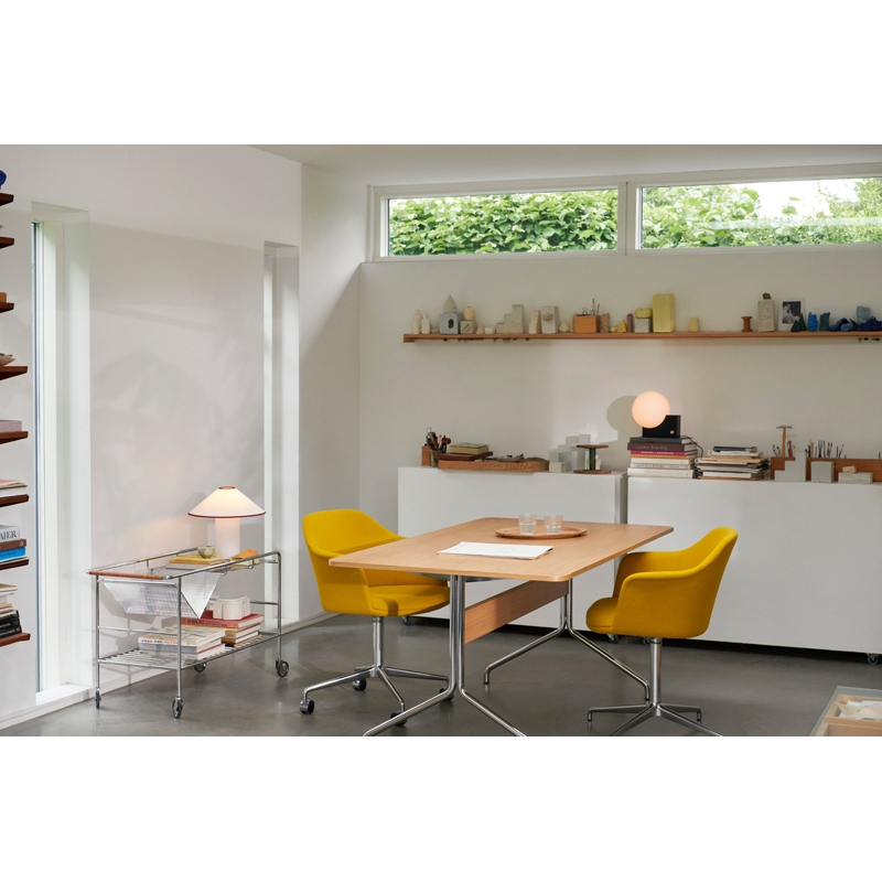 Dessinée par Anderssen & Voll pour And Tradition, Pavilion est une collection de meubles contemporains à l’esthétique légère et poétique. La table Pavilion est disponible en trois tailles. La plus grande, conçue pour 6 à 8 personnes est idéale dans une salle de réunion ou dans un espace repas, tandis que la plus petite, pour 4 personnes, s’intègre parfaitement dans la maison. La table Pavilion peut être coordonnée au bureau de la même collection, pour une expérience de design complète. Le plateau se décline en trois versions : chêne laqué noir, chêne laqué naturel et noyer laqué naturel. Les pieds sont quant à eux disponibles en noir mat ou chrome.