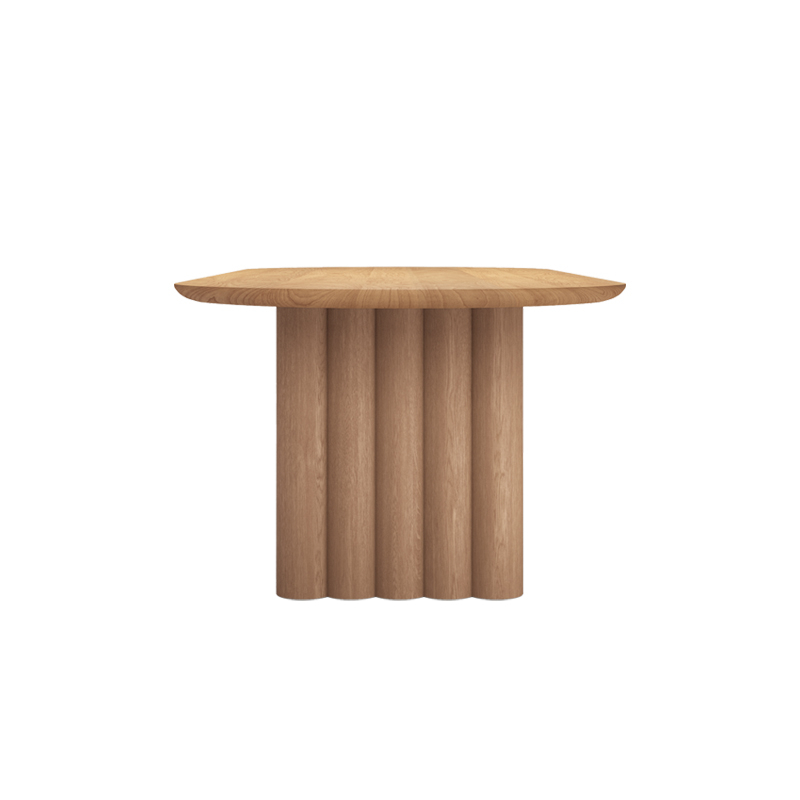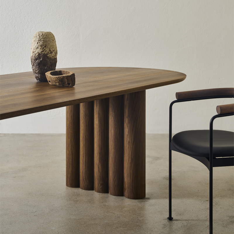 Tout au long du processus de conception, l'accent a été mis sur la création d'une ligne fine entre les pieds imposants et les formes courbes parfaitement équilibrées qui définissent le plateau en bois massif. La table Plush porte bien son nom avec ses formes douces qui, avec le bois robuste et l'élégant plateau, forment une unité impressionnante.