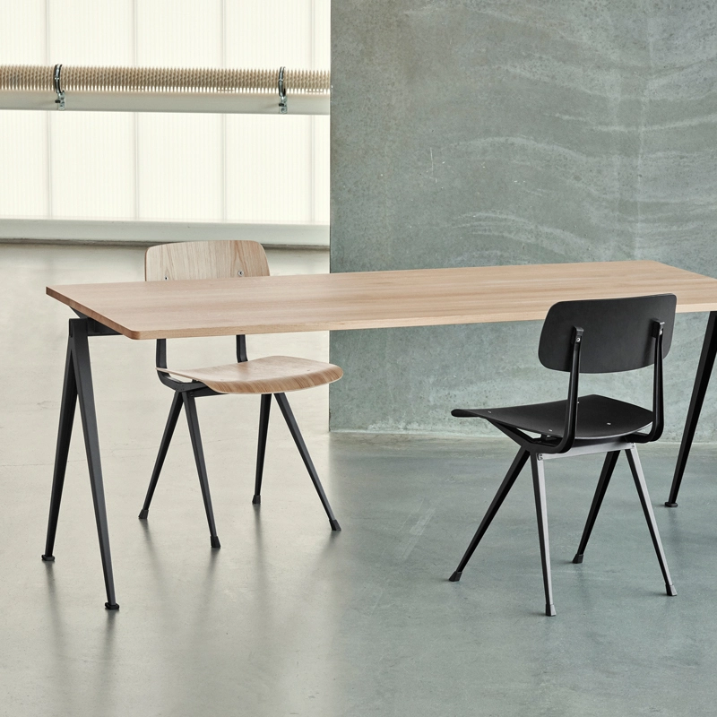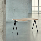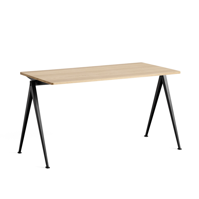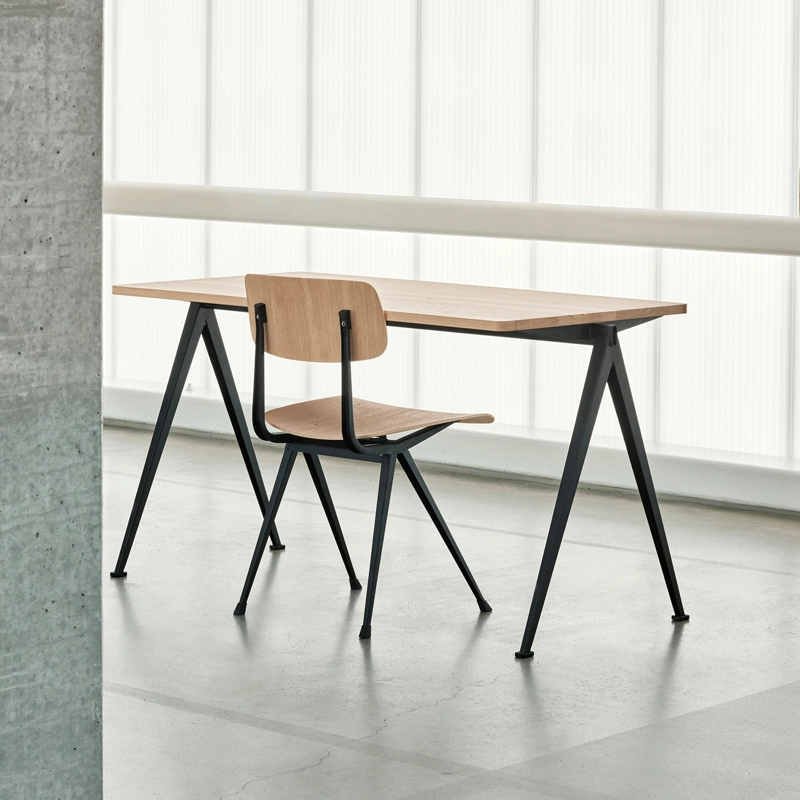 La série de tables Pyramid fait partie des collections relancées par Ahrend en collaboration avec la marque danoise Hay. Cette collection a été créée à l’origine par Friso Kramer et Wim Rietvield alors qu’ils travaillaient chez Ahrend dans les années 50. Considérées comme une création novatrice, les tables Pyramid résultent d’une utilisation innovante de la tôle d’acier sur un produit à la forme organique et contemporaine. Complété par une fine base en tôle d’acier, le plateau rectangulaire en chêne offre à la série Pyramid un caractère fonctionnel et épuré. Résultant d’une construction simple et d’une utilisation de matériaux durables et solides, les tables Pyramid 01 éditée par Hay sont également empilables ce qui les rendent appropriées pour une utilisation au sein d’établissement d’enseignement, d’espaces dédiés aux entreprises et aux particuliers.