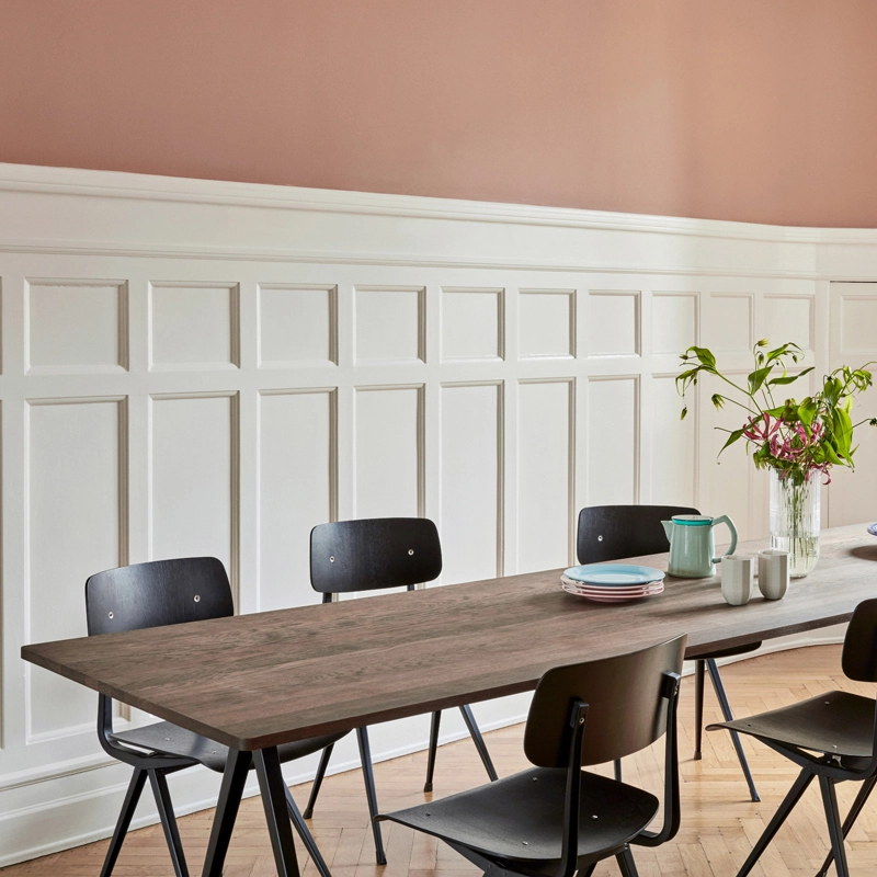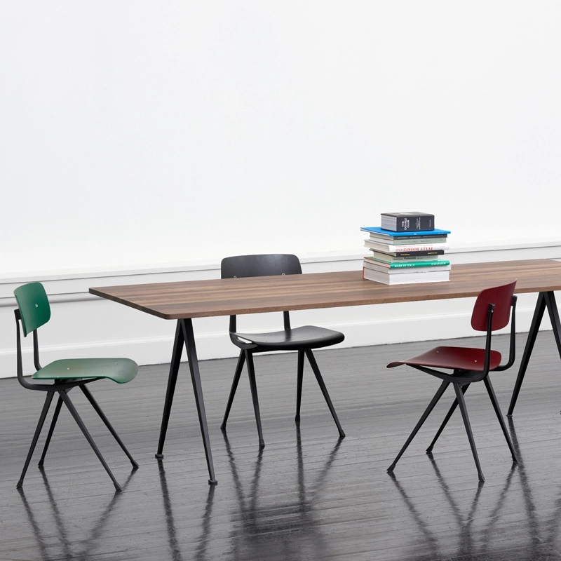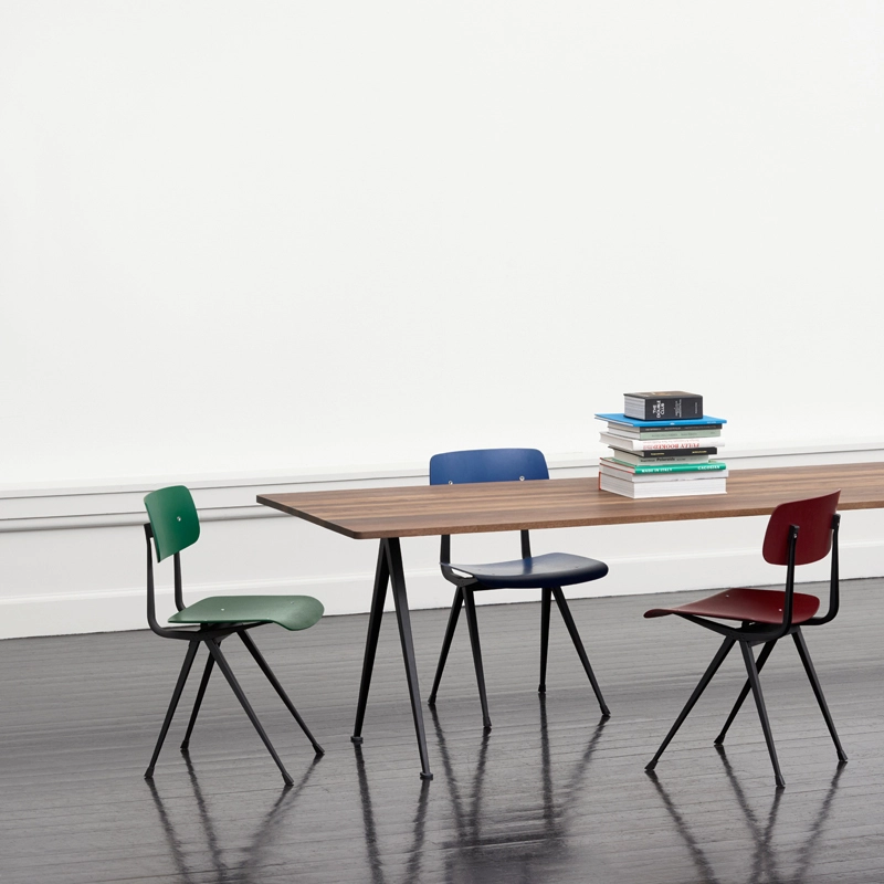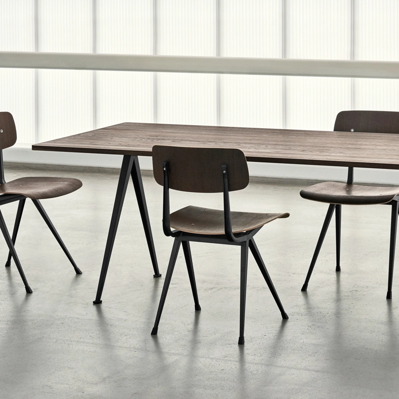 La série de tables Pyramid fait partie des collections relancées par Ahrend en collaboration avec la marque danoise Hay. Cette collection a été créée à l’origine par Friso Kramer et Wim Rietvield alors qu’ils travaillaient chez Ahrend dans les années 50. Considérées comme une création novatrice, les tables Pyramid résultent d’une utilisation innovante de la tôle d’acier sur un produit à la forme organique et contemporaine. Complété par une fine base en tôle d’acier, le plateau rectangulaire en chêne offre à la série Pyramid un caractère fonctionnel et épuré. Résultant d’une construction simple et d’une utilisation de matériaux durables et solides, les tables Pyramid éditées par Hay se prêtent à différentes utilisations.