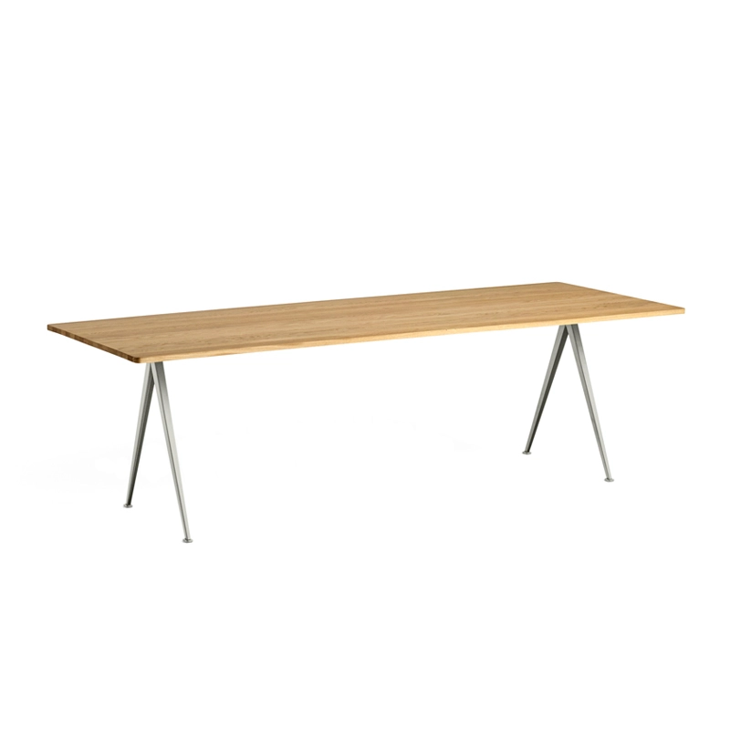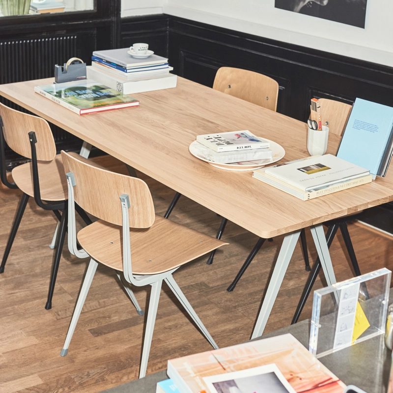 La série de tables Pyramid fait partie des collections relancées par Ahrend en collaboration avec la marque danoise Hay. Cette collection a été créée à l’origine par Friso Kramer et Wim Rietvield alors qu’ils travaillaient chez Ahrend dans les années 50. Considérées comme une création novatrice, les tables Pyramid résultent d’une utilisation innovante de la tôle d’acier sur un produit à la forme organique et contemporaine. Complété par une fine base en tôle d’acier, le plateau rectangulaire en chêne offre à la série Pyramid un caractère fonctionnel et épuré. Résultant d’une construction simple et d’une utilisation de matériaux durables et solides, les tables Pyramid éditées par Hay se prêtent à différentes utilisations.