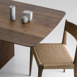 Le plateau et les pieds de Ten sont en bois massif, mais elle réussit à donner une sensation une légèreté, soulignée par les détails artisanaux raffinés comme les belles rainures verticales des pieds et le plateau de table distinctif aux formes organiques. La forme légèrement incurvée du plateau de table ne présente aucune ligne droite et, en combinaison avec le bord incliné de la table, il semble que le plateau bouge constamment, ce qui donne à la table Ten une expression unique.