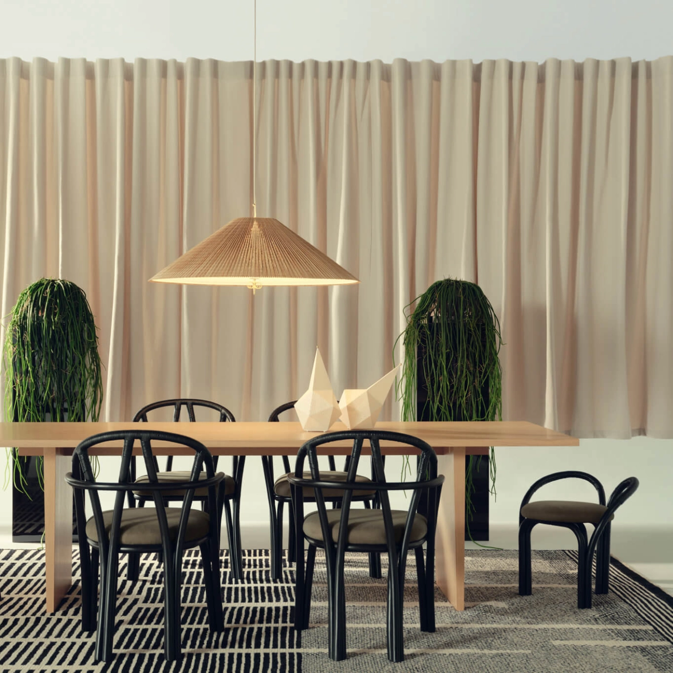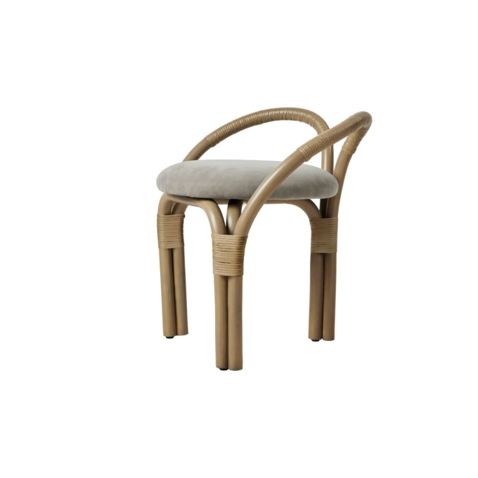 Conçu pour GUBI par Michele De Lucchi’s AMDL Circle, Bistra est une collection de meubles sculpturaux qui distille la chaise de bistrot classique à sa forme essentielle, trouvant l’élégance et l’intemporalité dans ses éléments structurels principaux. Ce travail de réduction formelle met en valeur la force du design minimal, où chaque ligne, chaque courbe, trouve sa place avec précision et poésie. Composée d’un fauteuil de salle à manger, d’un fauteuil et d’un tabouret à trois pieds, la collection est enracinée dans sa matière principale : le rotin recourbé à la vapeur. Ce matériau naturel, souple et résistant, est travaillé selon des techniques artisanales traditionnelles qui permettent d’en révéler toute la richesse expressive. Il confère à l’ensemble une présence à la fois chaleureuse et organique. Son langage visuel s’inspire de l’idée de la croissance organique, exprimée dans les contours arborescents des jambes, des bras et du dossier, et résonnée dans le rembourrage conçu sur mesure, qui présente un motif botanique inspiré d’une fresque de Léonard de Vinci. L’esthétique de Bistra évoque ainsi le monde végétal, comme si chaque pièce prenait racine dans l’espace. Le motif textile ajoute une dimension artistique et narrative, renforçant le lien entre nature, art et design. Disponible en trois couleurs de cadre et plusieurs tissus, Bistra est une collection de sièges polyvalente qui mélange des traditions artisanales de fabrication de meubles avec un artisanat contemporain exquis. Elle s’adapte avec élégance à une variété d’environnements, des intérieurs résidentiels aux espaces publics, et incarne une vision du design où savoir-faire et créativité contemporaine dialoguent avec subtilité.