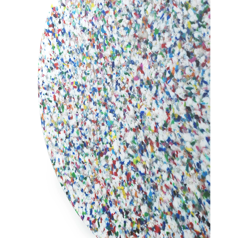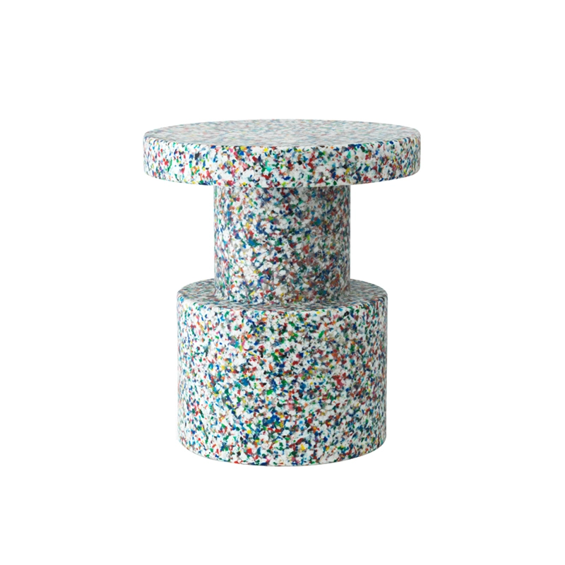 Bit est un meuble pluriel et sculptural qui peut avoir de multiples fonctions dans un intérieur. Vous pouvez par exemple utiliser Bit comme piédestal pour une belle décoration florale, comme table d’appoint pour y poser une lampe ou comme tabouret pour un convive supplémentaire. Pour concevoir le multifonctionnel Bit, le designer Simon Legald s’est inspiré de formes immuables comme les monolithes et les piliers. La rigueur de sa forme est brisée par sa surface caractéristique et pixélisée grâce aux petits morceaux de 100% plastique recyclé d’origine industrielle et ménagère. Une méthode particulière où les fragments de plastique sont chauffés jusqu’à leur point de fusion à 120 degrés, et qui permet de recycler et de refusionner la matière un grand nombre de fois sans modifier ses propriétés. Il en résulte une profondeur et une composition singulières rendant chaque table Bit unique. Bit est disponible en quatre jolis coloris. Alors que la production et la matière sont mises en évidence par l’aspect multicolore et gris chiné, la table noire et blanche s’intègre humblement dans un intérieur existant. Avec sa forme subtile et son jeu de couleur accrocheur, Bit donne de la personnalité à toute décoration intérieure. Le tabouret Bit résiste aux températures allant de - 10 à 50 °C et trouvera sa place à l’intérieur comme à l’extérieur.