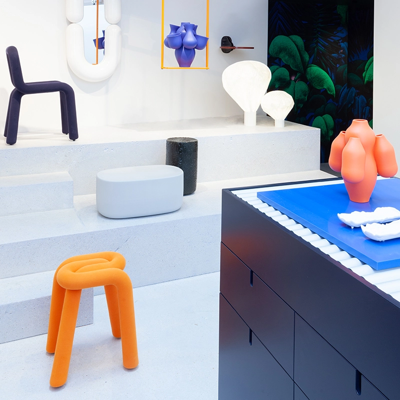 Dessiné par Big-Game pour la marque française Moustache, Bold est un tabouret original et sculptural. Composé de 2 parties tubulaires identiques en métal imbriquées l’une dans l’autre, le tabouret Bold, comme la chaise avant lui, réactualise la tradition de l'assise en tube d’acier cintré. Gonflé d’une épaisse mousse, épaissi telle la police de caractère à laquelle on applique une graisse, le tabouret Bold fait l’économie d’un siège. Recouvert d’un gainage textile déhoussable et lavable, le tabouret Bold de Moustache peut changer de couleur en quelques instants.