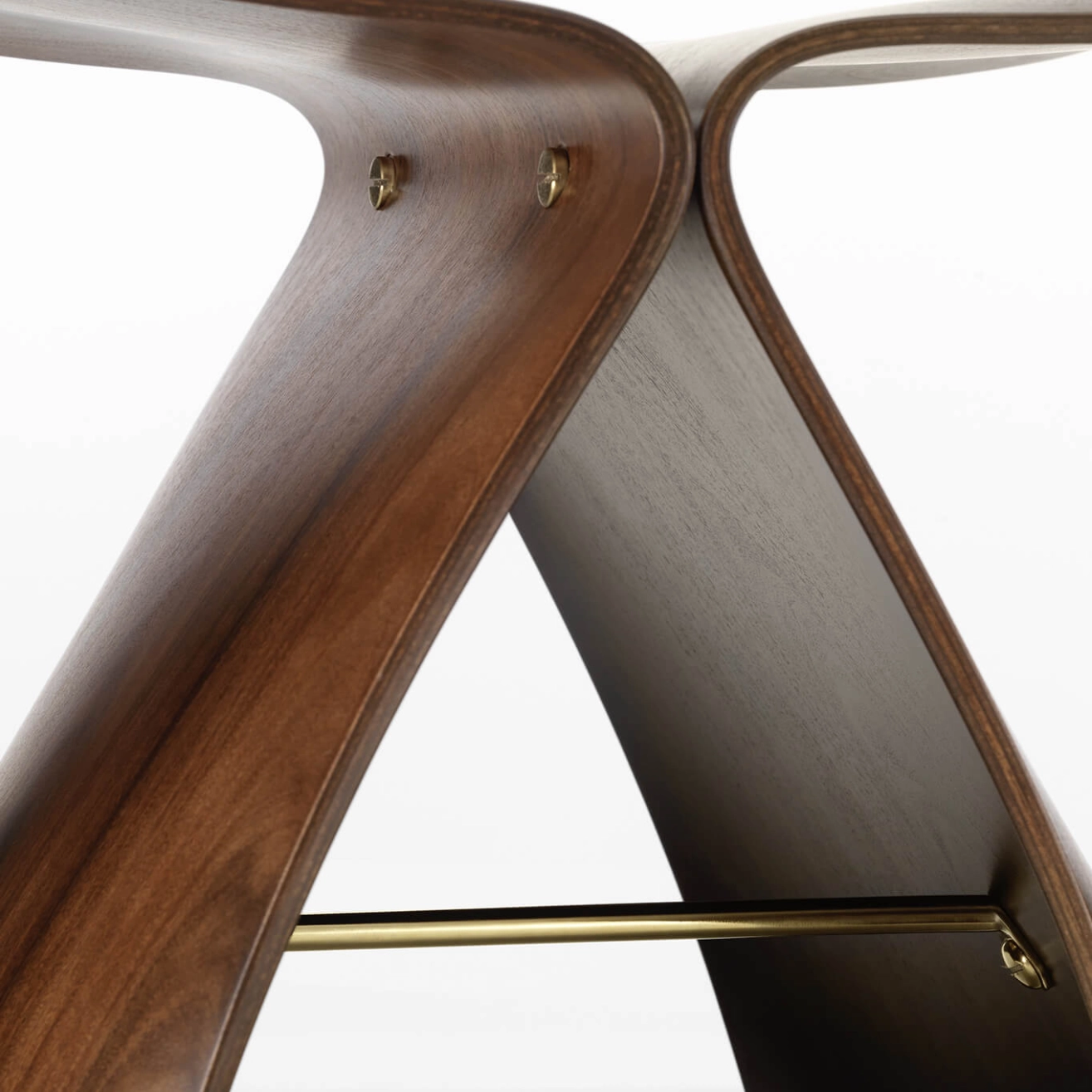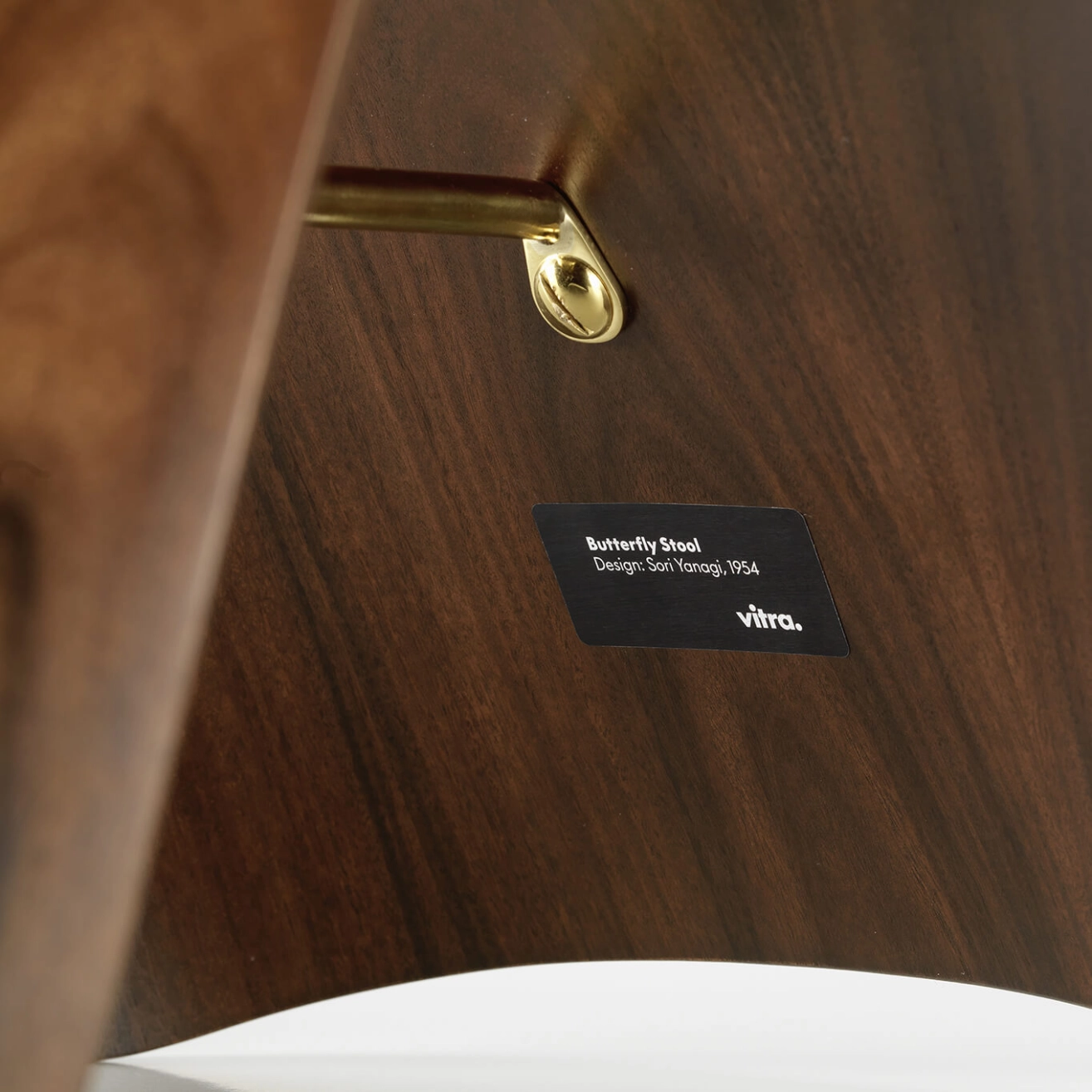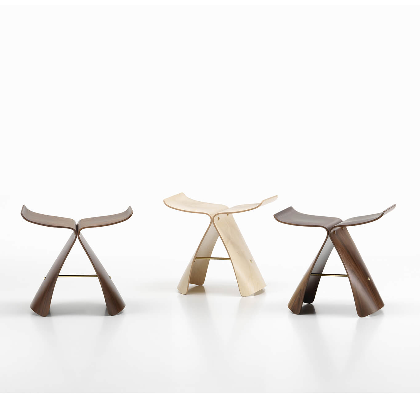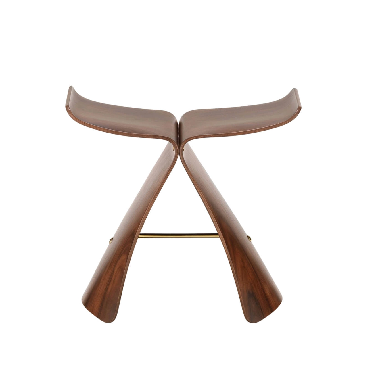 tabouret Butterfly Stool se compose de deux formes identiques incurvées en placage de bois moulé, reliées par une barre en laiton et deux boulons. Il en résulte un siège dont la forme fait penser d’une part aux coffrets shintoistes, les « torii » et d’autre part à un papillon en vol, dont l’élégant tabouret tient le nom. Le