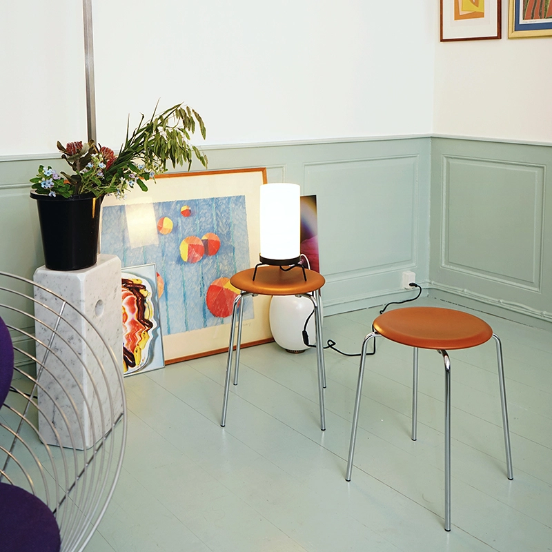Fritz Hansen réédite le tabouret Dot dans une nouvelle version, composée d'une assise revêtue de cuir et d'un piètement chromé. Le siège est réalisé à partir de chutes de cuir, provenant de la réalisation des fauteuils Egg et Swan. Le tabouret Dot, pièce emblématique du design scandinave, fut développé dans les années 50 au moment où Arne Jacobsen concevait la chaise Fourmi. Le designer passait beaucoup de temps à l'usine de Fritz Hansen, testant, affinant et finalisant son projet pour obtenir ce tabouret présenté sur le marché en 1954. Léger et empilable, le tabouret Dot offre un confort d'assise pour se placer habilement dans les pièces de votre intérieur.