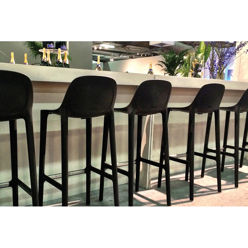 Avec Broom, Philippe Starck et Emeco ont créé ensemble une collection de sièges à partir de matériaux recyclés et recyclables, conçue pour durer. Broom est composée de 75% de polypropylène recyclé et de 15% de fibre de bois recyclée qui auraient autrement été des déchets. "Imaginez", a dit Philippe Starck, "une personne prend un balai et commence à nettoyer l'atelier, et avec la poussière elle fait de la magie". C'est pour ça que cette série s'appelle Broom, balai en anglais. Editée par Emeco, la collection Broom est composée de polypropylène et sciure de bois recyclés, et de fibre de verre. Les tabourets hauts Broom conviennent aussi à une utilisation à l’extérieur.