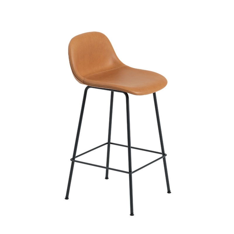 Tabouret haut FIBER BAR STOOL Avec dossier pieds acier H65 siège cuir Cognac MUUTO