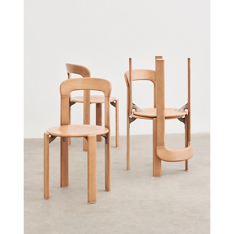 assise et dossier contreplaqué moulé recouvert de hêtre, pieds hêtre massif, laque à base d'eau, repose-pieds acier chromé