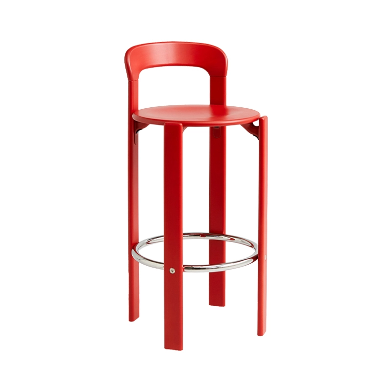 tabouret Rey assurent robustesse et esthétique chaleureuse, tandis que la finition laquée à base d'eau est écologique et durable. Le repose-pieds en acier chromé ajoute une touche de modernité et de confort. Idéal autour d'un îlot de cuisine ou devant un bar, le
