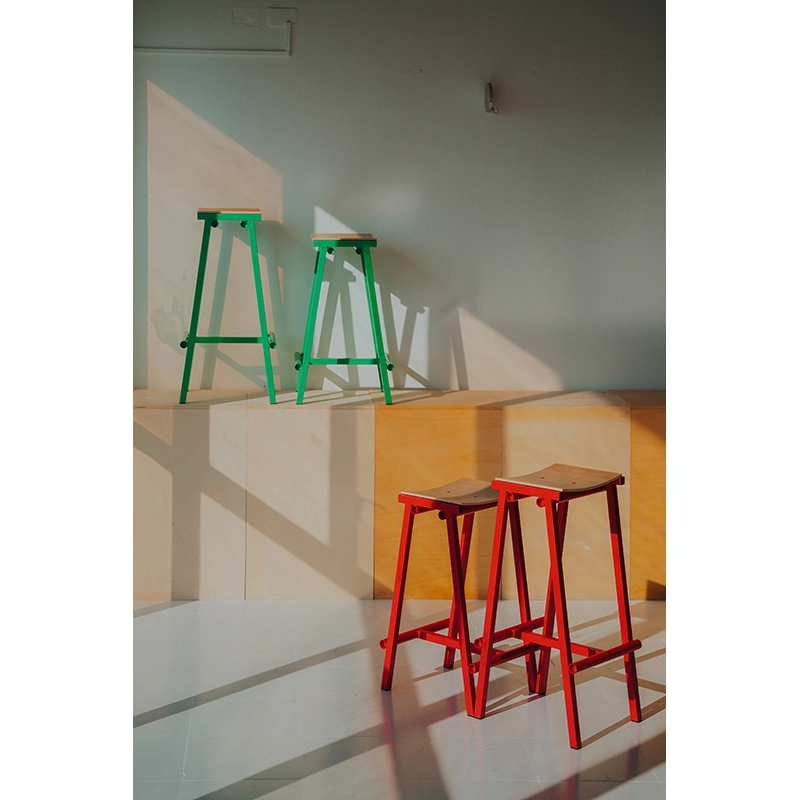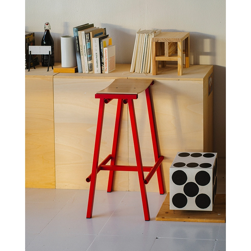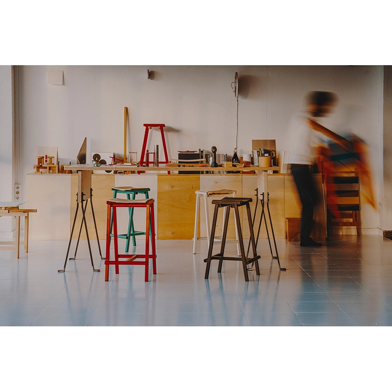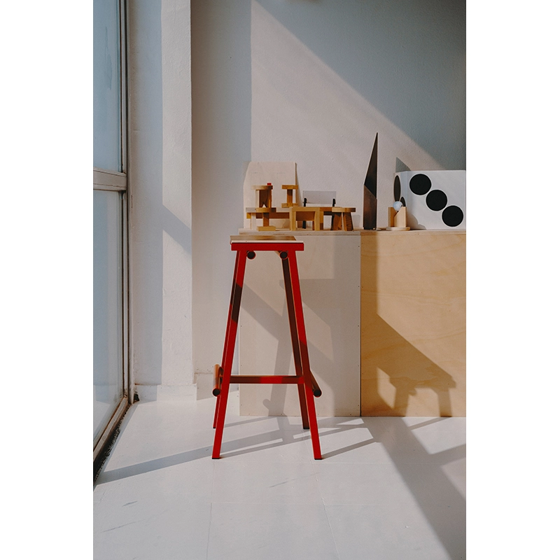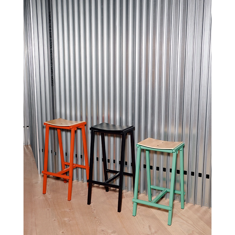 Conçu par Marc Morro Studio et édité par Hay, le tabouret haut de bar Taburete 8 H 76 marque le début d'une collaboration passionnante avec le designer espagnol. Nommé "8" en référence aux huit prototypes nécessaires pour atteindre la version finale, ce tabouret incarne une esthétique honnête et radicale propre à l'approche directe de Morro en matière de design. Disponible en deux hauteurs (66 cm et 76 cm), le Taburete 8 H 76 combine une assise courbée en contreplaqué et un cadre en tubes d'acier. Les différents composants sont mis en valeur par leur simplicité brute et un usage audacieux de la couleur. Sa construction robuste et son expression minimaliste en font un meuble polyvalent, facile à intégrer dans une grande variété d'environnements, que ce soit dans des bars, des restaurants ou des espaces privés.