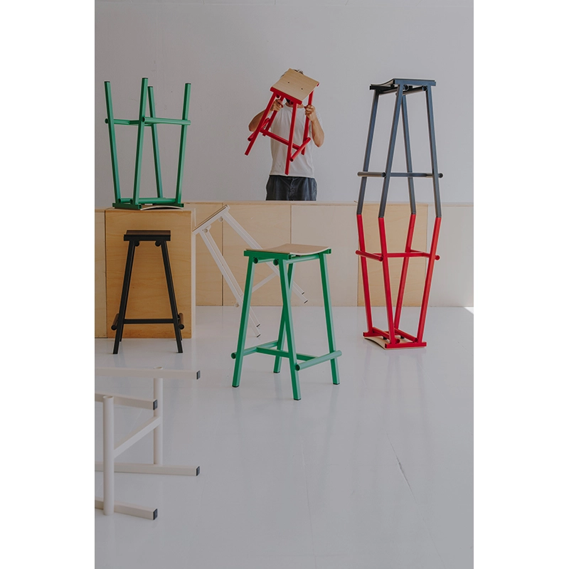 Conçu par Marc Morro Studio et édité par Hay, le tabouret haut de bar Taburete 8 H 76 marque le début d'une collaboration passionnante avec le designer espagnol. Nommé "8" en référence aux huit prototypes nécessaires pour atteindre la version finale, ce tabouret incarne une esthétique honnête et radicale propre à l'approche directe de Morro en matière de design. Disponible en deux hauteurs (66 cm et 76 cm), le Taburete 8 H 76 combine une assise courbée en contreplaqué et un cadre en tubes d'acier. Les différents composants sont mis en valeur par leur simplicité brute et un usage audacieux de la couleur. Sa construction robuste et son expression minimaliste en font un meuble polyvalent, facile à intégrer dans une grande variété d'environnements, que ce soit dans des bars, des restaurants ou des espaces privés.