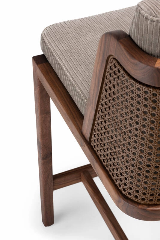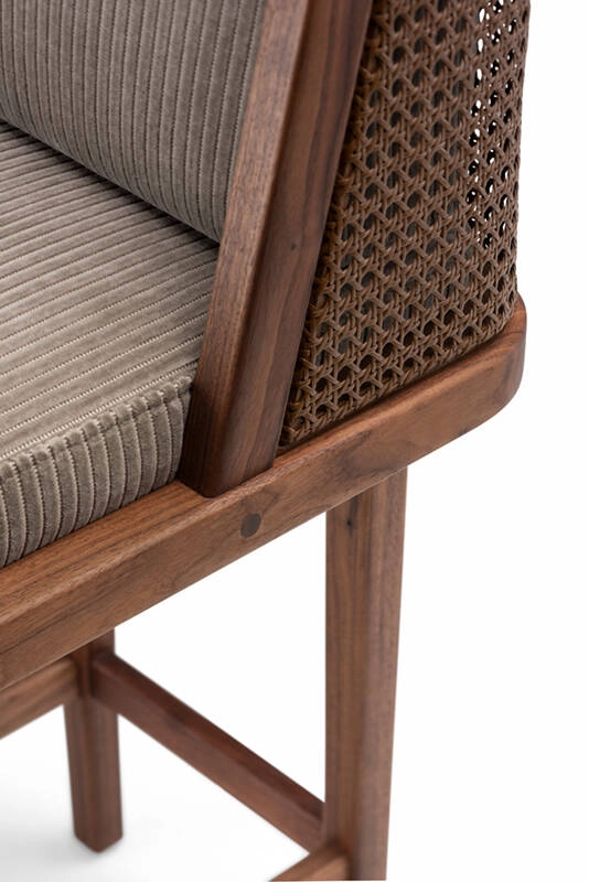 Le tabouret de bar Throne de De La Espada marie tradition et modernité, rappelant les influences Art déco d'Autoban. Throne fait partie d'une famille de meubles qui comprend une chaise de salle à manger, une chaise longue et un canapé, disponible avec un dossier en rotin ou rembourré.
