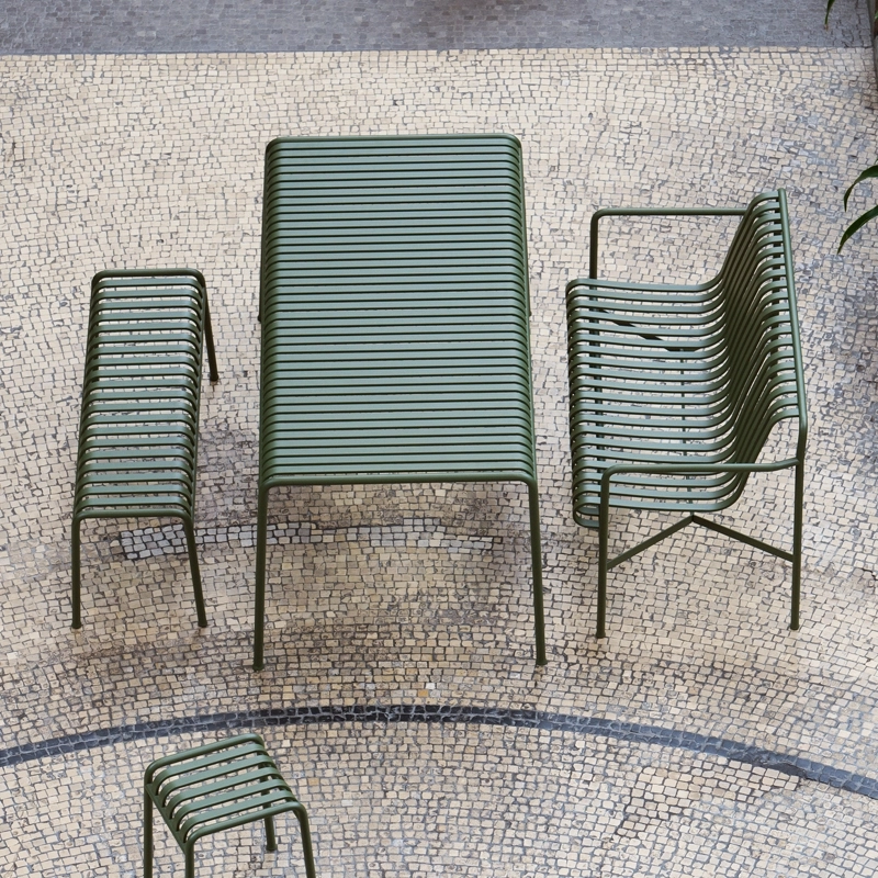 Palissade est une collection de mobilier d'extérieur dessinée par Ronan et Erwan Bouroullec pour la marque Hay. La série est composée d'une large gamme de mobilier, dans laquelle toutes les pièces partagent le même principe de conception. Elle comprend des chaises, petits fauteuils, fauteuils lounge, tabourets, tables et bancs. Spécialement conçues pour un usage extérieur, ces pièces sont visuellement légères mais robustes dans leur réalisation. Inspirée par des meubles classiques, la collection trouve son originalité dans les détails. Bien que conçus en acier, ces meubles outdoor sont confortables simplement grâce à leur design. Chaque pièce est disponible en vert olive, gris clair ou anthracite et s'intègre très bien dans un environnement naturel ou urbain. Avec Palissade, les frères Bouroullec ont imaginé une collection de mobilier outdoor durable qui s'associe facilement à tous les styles : un futur Classique du design !