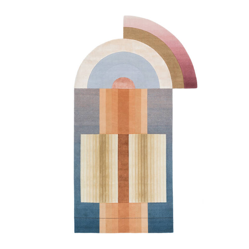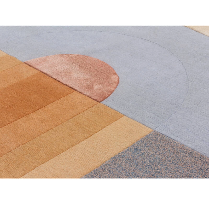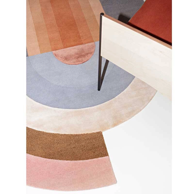 tapis Bliss se caractérise par un effet tridimensionnel sculptural qui a été inspiré initialement des expérimentations de Mae Engelgeer autour des formes rondes et courbes. Ce travail arrive après une période où la designer travaillait uniquement sur des lignes droites et, finissant par se sentir enfermée par celles-ci, elle a ressenti le besoin d’utiliser des formes plus audacieuses. En gardant en tête l’aspect ludique du mouvement Memphis et en mixant les motifs et les formes avec différentes techniques de production, la collection