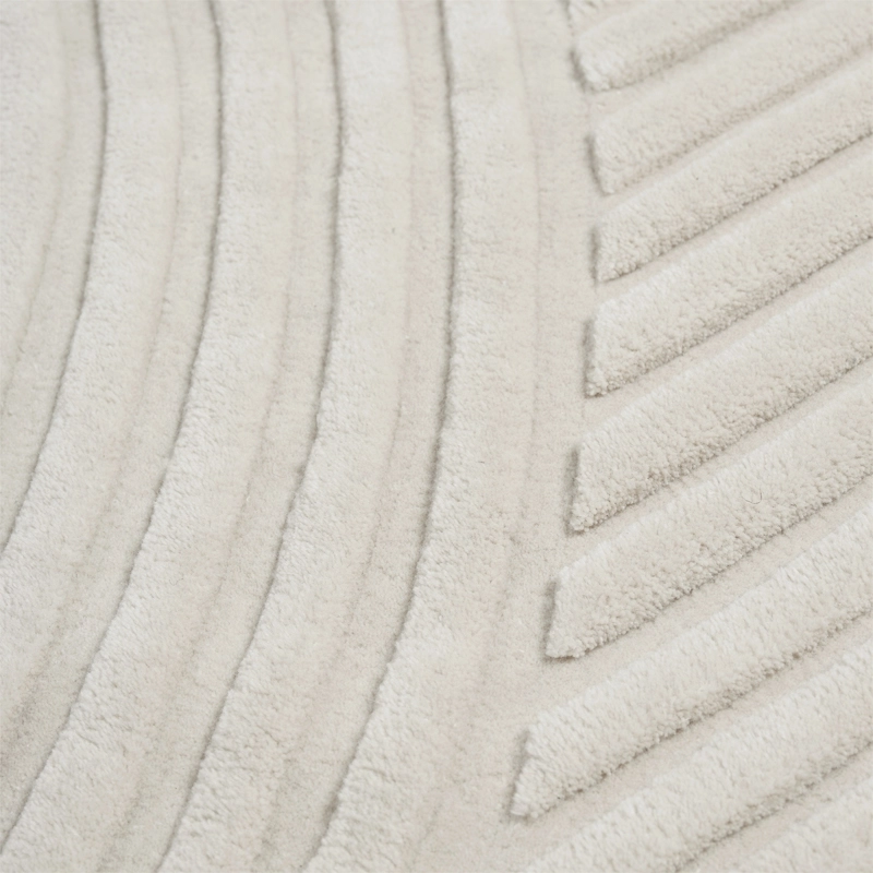 Relevo, qui signifie « soulagement » en latin, apporte une qualité sculpturale à la pièce et en même temps une sensation de confort douillet. Les sillons sont réalisés en taillant la laine de Nouvelle-Zélande à différents niveaux, créant un motif graphique percutant et une impression visuelle de profondeur. Cette technique forme des ombres qui donnent l’impression que le