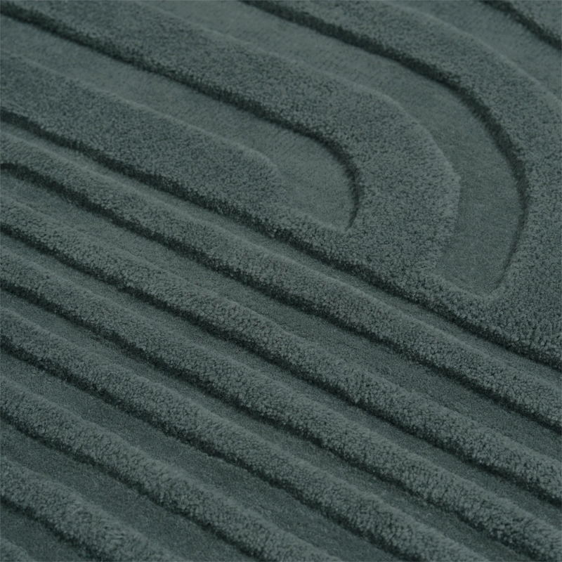 Relevo, qui signifie « soulagement » en latin, apporte une qualité sculpturale à la pièce et en même temps une sensation de confort douillet. Les sillons sont réalisés en taillant la laine de Nouvelle-Zélande à différents niveaux, créant un motif graphique percutant et une impression visuelle de profondeur. Cette technique forme des ombres qui donnent l’impression que le