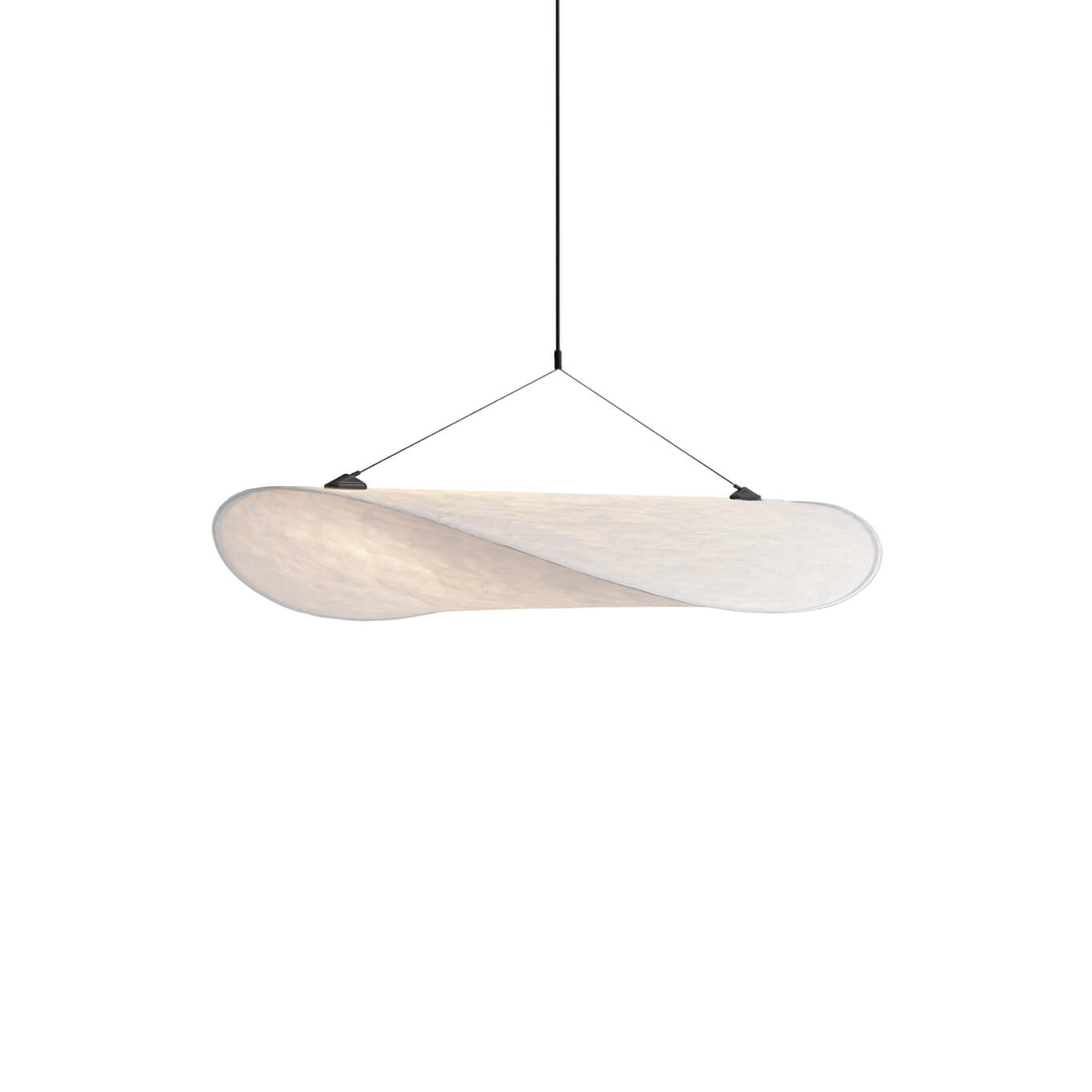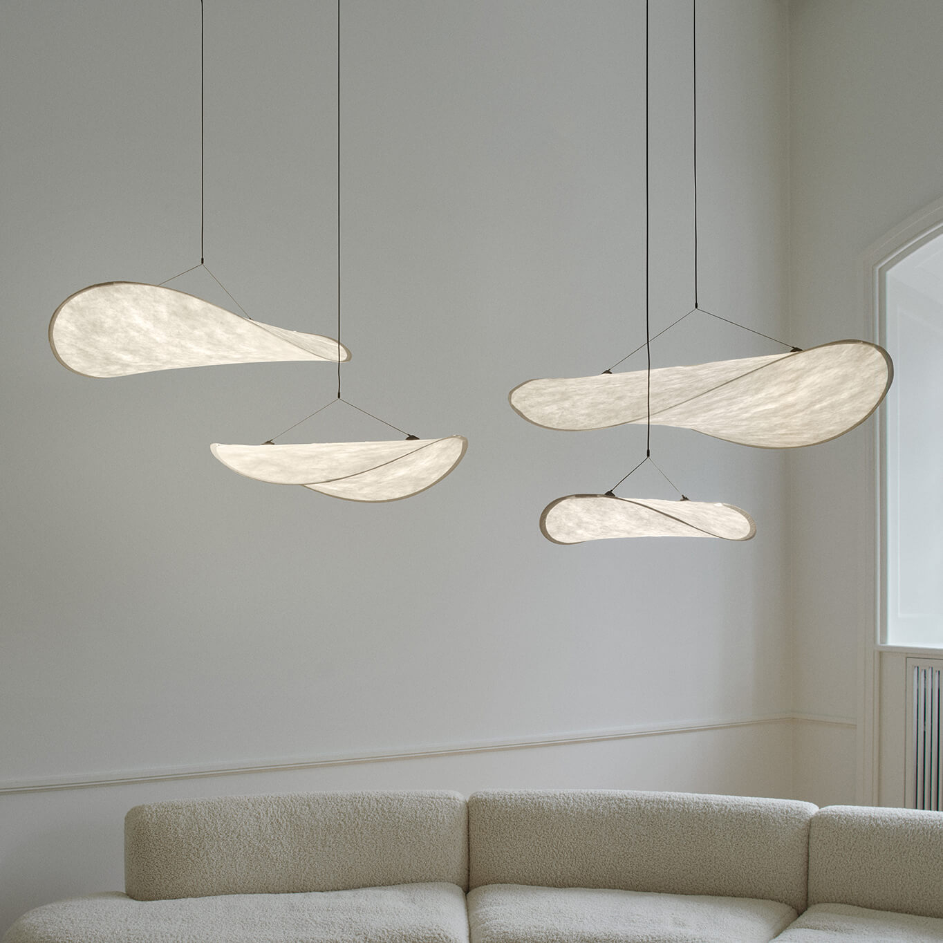 Avec ses dimensions imposantes, la suspension Tense ressemble à un nuage mou. Réalisation vraiment moderne, le diffuseur en Tyvek représente un matériau à la fois durable et doux - tout en étant 100% recyclable. La flexibilité de ce diffuseur comme du papier permet à sa structure fine d'accentuer les qualités de nuage de la suspension Tense. Edité par New Works, ce luminaire aérien est équipé d'une ampoule LED mince. Tous les composants de la suspension Tense s'insèrent dans une boite pour faciliter le transport. Une approche vraiment moderne de l'éclairage.