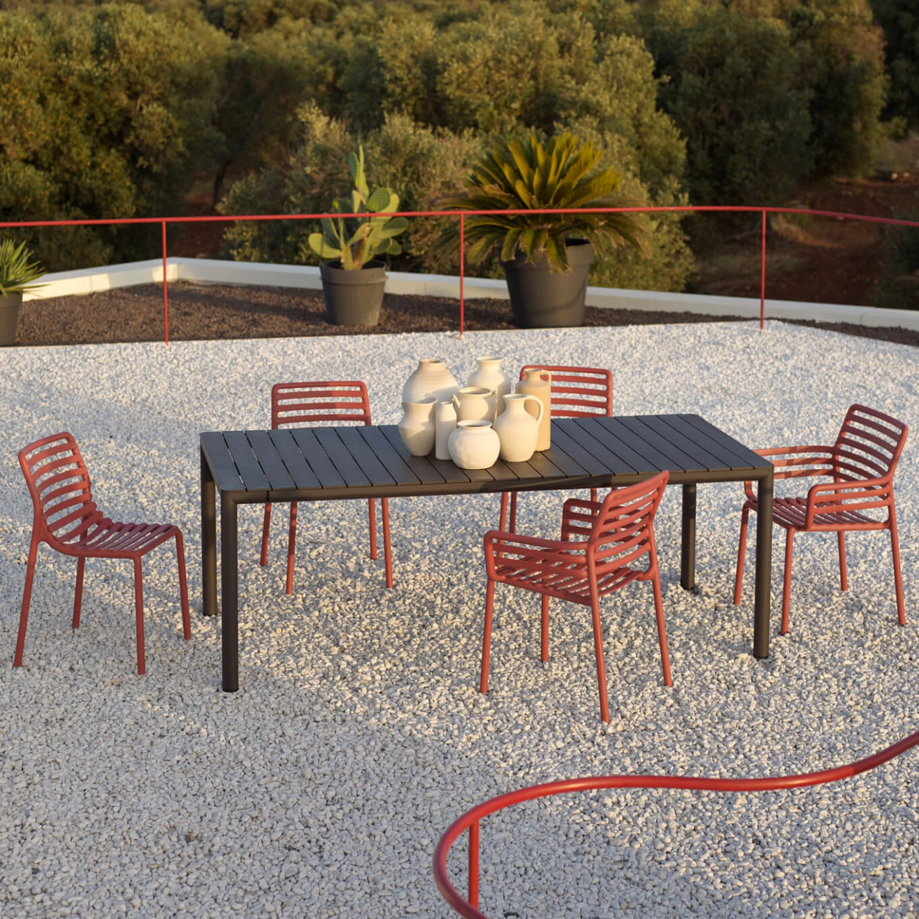 La table Tevere de Nardi dessinée par le designer italien Raffaello Galiotto, incarne parfaitement l’élégance et la praticité du mobilier d’extérieur moderne. Avec son design épuré et équilibré, la Tevere séduit par ses lignes sobres et sa robustesse. Fabriquée en polypropylène renforcé de fibre de verre, elle résiste aux intempéries, aux UV et à l’usure, tout en restant légère et facile à déplacer. Le plateau de la Tevere, à la texture douce et mate, offre un grand confort d’utilisation et s’intègre harmonieusement à tous types d’environnements : terrasses, jardins ou espaces professionnels. Disponible en plusieurs coloris contemporains, elle s’adapte aussi bien aux ambiances conviviales qu’aux décors raffinés. Durable, recyclable et entièrement fabriquée en Italie, la table Tevere reflète tout le savoir-faire et l’engagement design de Nardi, alliant qualité, esthétique et respect de l’environnement.