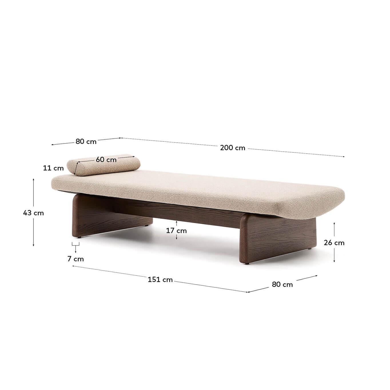 méridienne allie confort, responsabilité et esthétisme. Son assise à fermeté moyenne est accompagnée d’un coussin assorti, offrant un soutien optimal pour les moments de repos. La structure en bois de frêne, finition noyer, confère à la