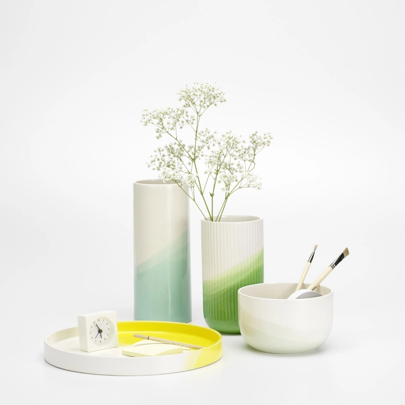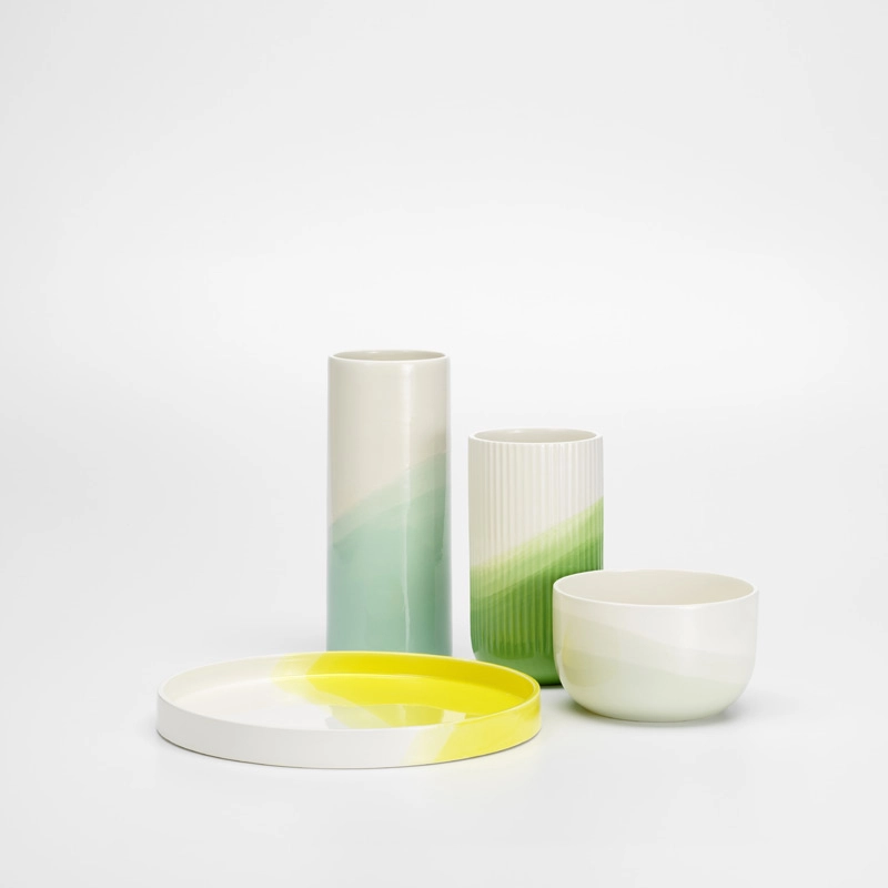 Créée par Raw-Edges pour l'ameublement et l'agencement d'un étage entier de la VitraHaus sur le Vitra Campus, la collection Herringbone est née de l‘intérêt du studio pour la technique de la teinture par immersion. Les Herringbone Vessels sont créés en plongeant à plusieurs reprises des bols et des vases en céramique dans une glaçure colorée. Ce processus réalise un motif obéissant à une logique intrinsèque, déterminée par l‘angle d‘immersion ainsi que par la forme et le poids de l‘objet. La transformation de différents matériaux et formes par trempage dans un bain de teinture exerce une fascination presque magique sur le duo de designers Shay Alkalay et Yael Mer, ce qui a conduit à la décision d‘affiner encore la conception de la collection Herringbone pour la production en série chez Vitra. Entièrement réalisé à la main, chaque bol, vase et plateau de la collection Herringbone Vessels est un objet unique.