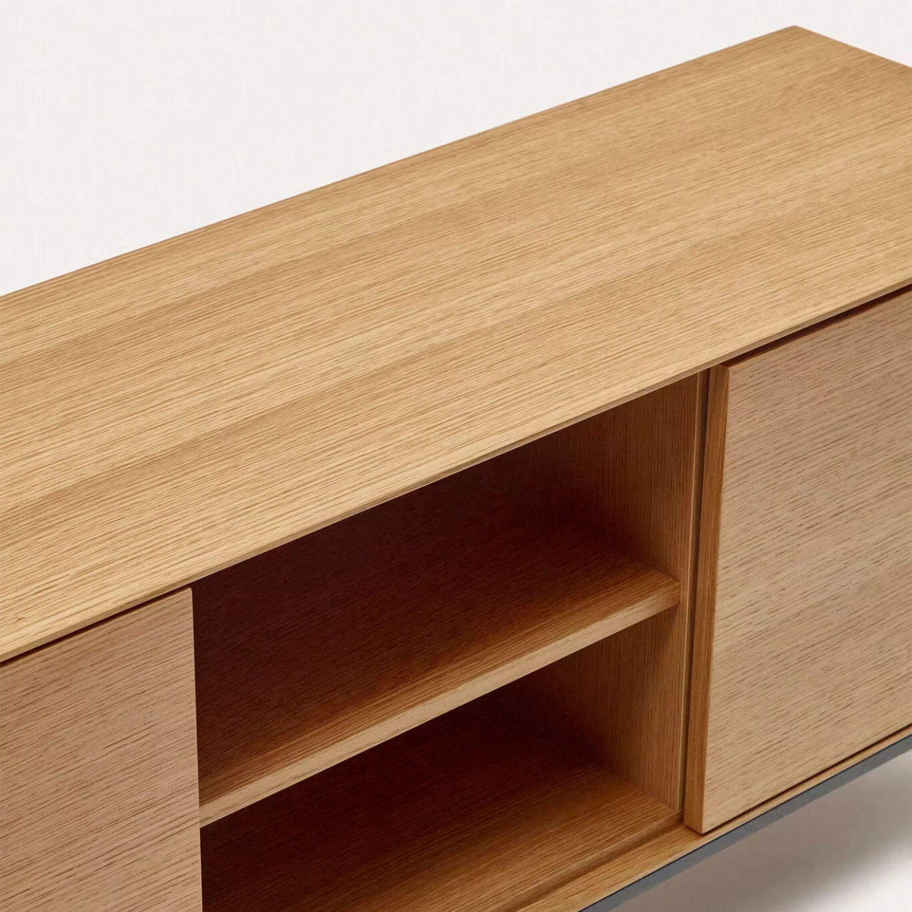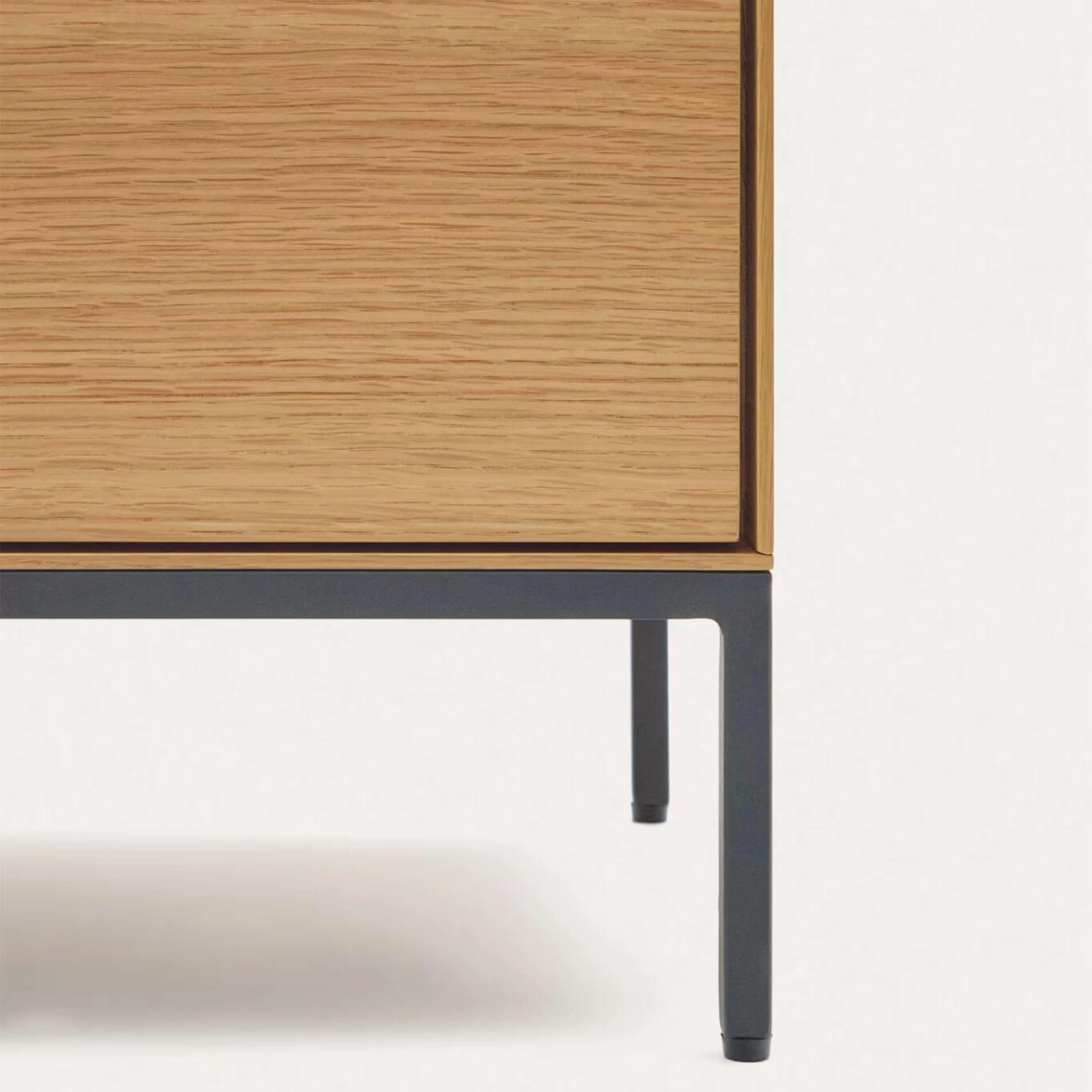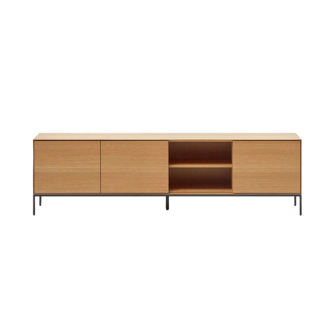 Vedrana est un meuble TV 3 portes en placage de chêne avec pieds en acier noir, conçu exclusivement par l’équipe de Kave Home. Il fait partie de la collection Vedrana, qui combine élégance, légèreté et fonctionnalité pour sublimer tous les espaces intérieurs. Les trois portes s’ouvrent par pression et sont équipées de charnières à fermeture douce pour un usage pratique et silencieux. Les pieds réglables en acier, à la finition gris anthracite mat, assurent une stabilité parfaite sur toutes les surfaces. Cette collection allie le charme naturel du placage de chêne à la robustesse de l’acier, offrant une solution idéale pour organiser votre espace avec style, tout en apportant une touche contemporaine à votre intérieur.
