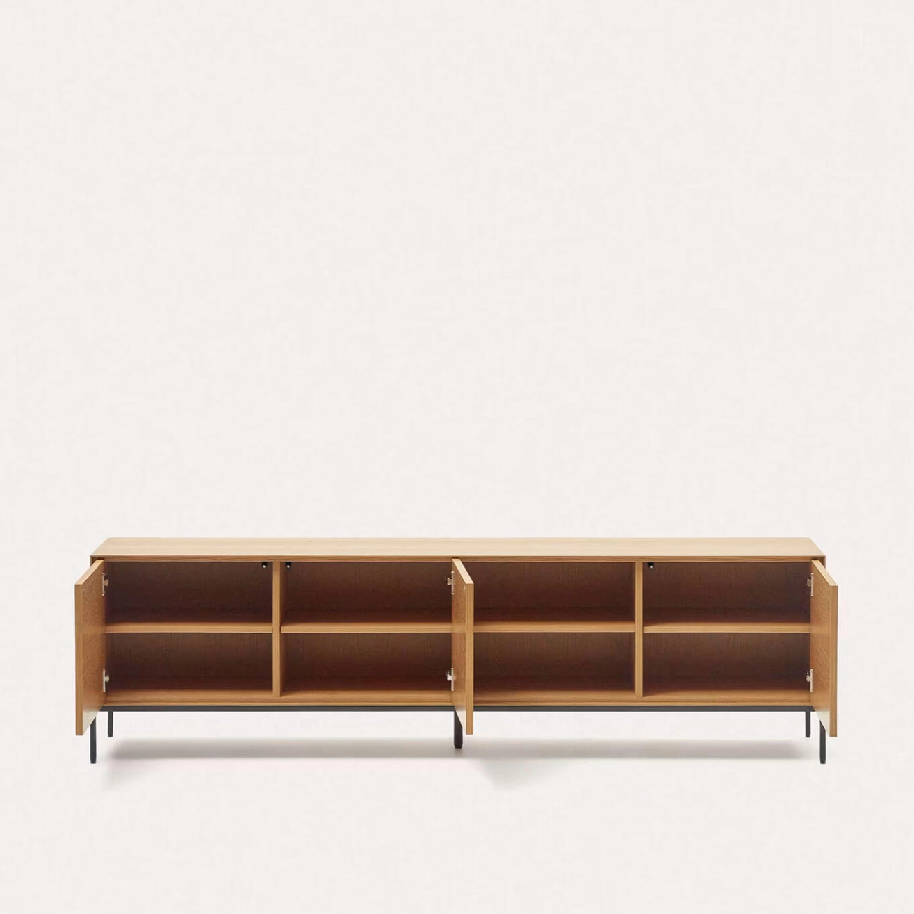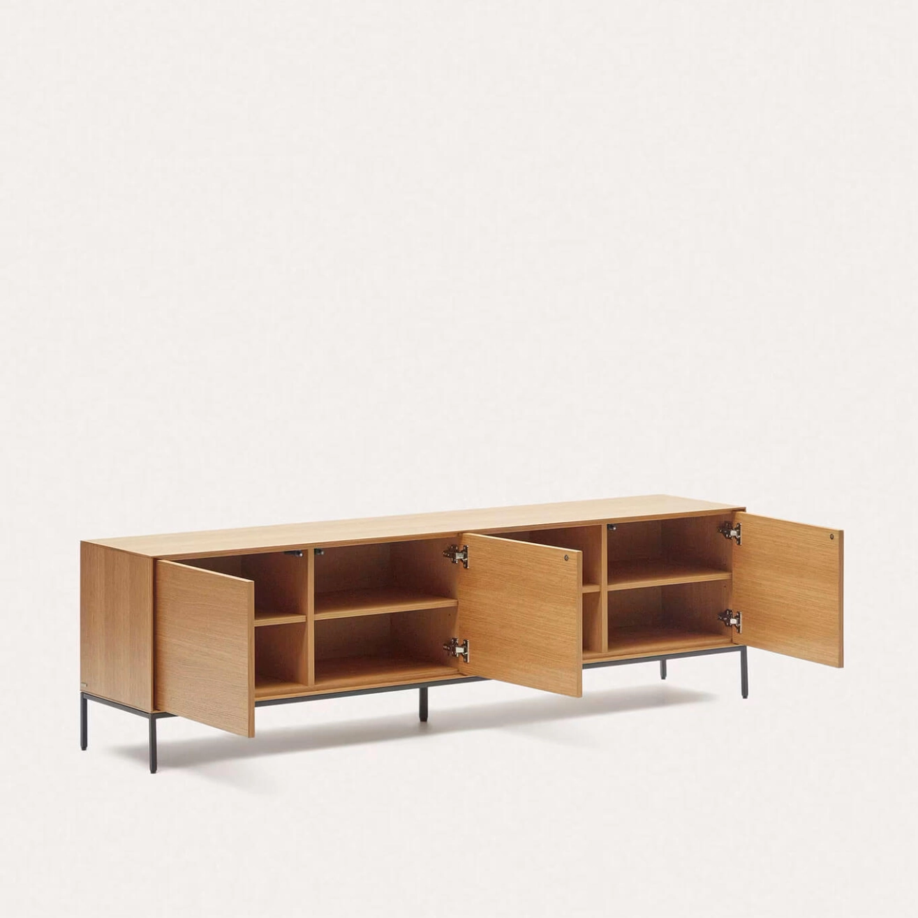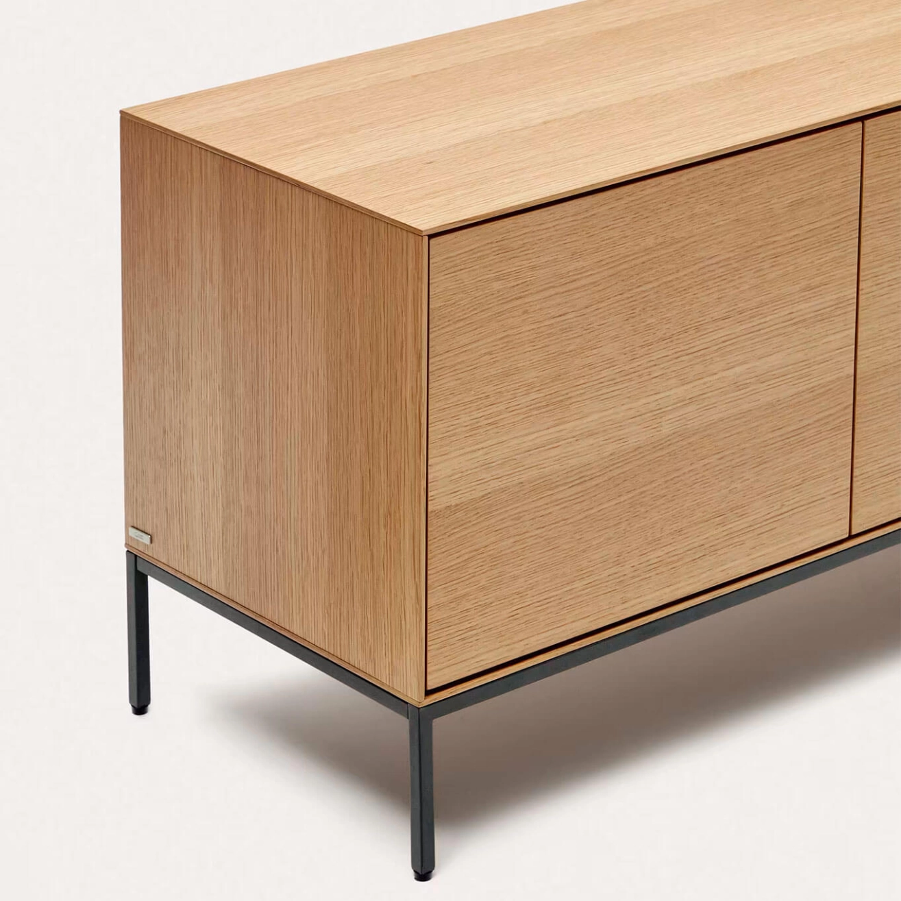 Vedrana est un meuble TV 3 portes en placage de chêne avec pieds en acier noir, conçu exclusivement par l’équipe de Kave Home. Il fait partie de la collection Vedrana, qui combine élégance, légèreté et fonctionnalité pour sublimer tous les espaces intérieurs. Les trois portes s’ouvrent par pression et sont équipées de charnières à fermeture douce pour un usage pratique et silencieux. Les pieds réglables en acier, à la finition gris anthracite mat, assurent une stabilité parfaite sur toutes les surfaces. Cette collection allie le charme naturel du placage de chêne à la robustesse de l’acier, offrant une solution idéale pour organiser votre espace avec style, tout en apportant une touche contemporaine à votre intérieur.