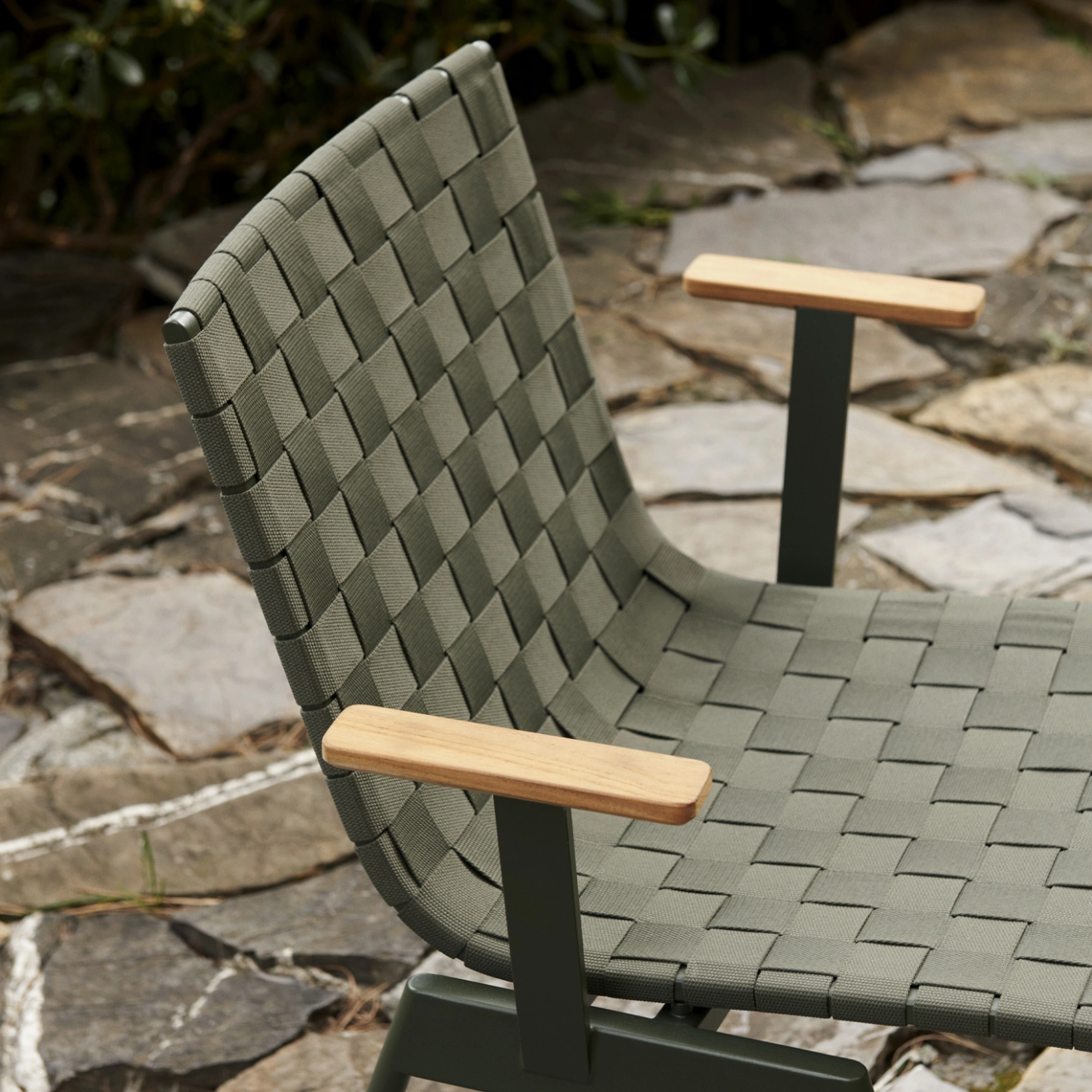 Sangles tressées en polyester accoudoirs en teck et piètement en acier poudré