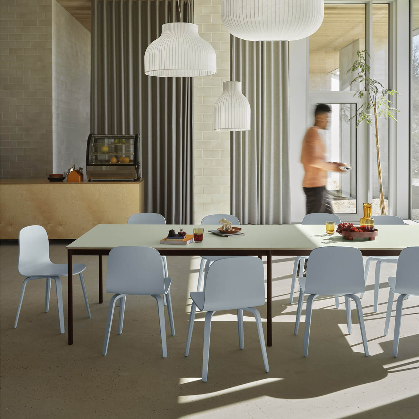 Visu est une collection de sièges dessinée par Mika Tolvanen pour Muuto. Après les paniers Restore, le designer réinterprète la traditionnelle chaise en contreplaqué moulé. Il crée ainsi une famille d'assises modernes pour différents usages : une chaise avec un piètement luge ou avec des pieds bois, une chauffeuse et un tabouret de bar. Ces sièges sont disponibles dans plusieurs couleurs de bois ou recouverts de tissu. Chacun peut ainsi trouver le fauteuil qui lui correspond ou créer des mélanges de couleurs de chaises à placer autour de la table de la salle à manger.