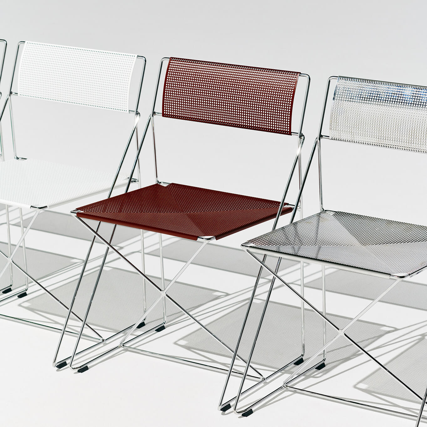 Créée à la fin des années 70 par Niels Jørgen Haugesen, la chaise X-Line s’inscrit désormais dans l’univers de HAY, qui réunit des designs originaux et intemporels. Conçue en fil métallique fin, elle allie une esthétique industrielle à une fabrication en acier de haute précision, incarnant parfaitement l’esprit du mouvement high-tech des années 1970. Son design minutieusement élaboré garantit une fonctionnalité optimale. Sa structure en X, fruit d’un processus de conception soigné, lui confère souplesse, solidité< et attrait visuel. Proposée avec une assise déclinée en plusieurs couleurs soigneusement sélectionnées et des pieds en acier chromé, la chaise X-Line reste fidèle à une approche de design simple et rationnelle, toujours d’actualité. Son apparence épurée, combinée à sa robustesse et à son caractère empilable, en fait une solution d’assise polyvalente, parfaitement adaptée aux environnements privés comme professionnels en intérieur.