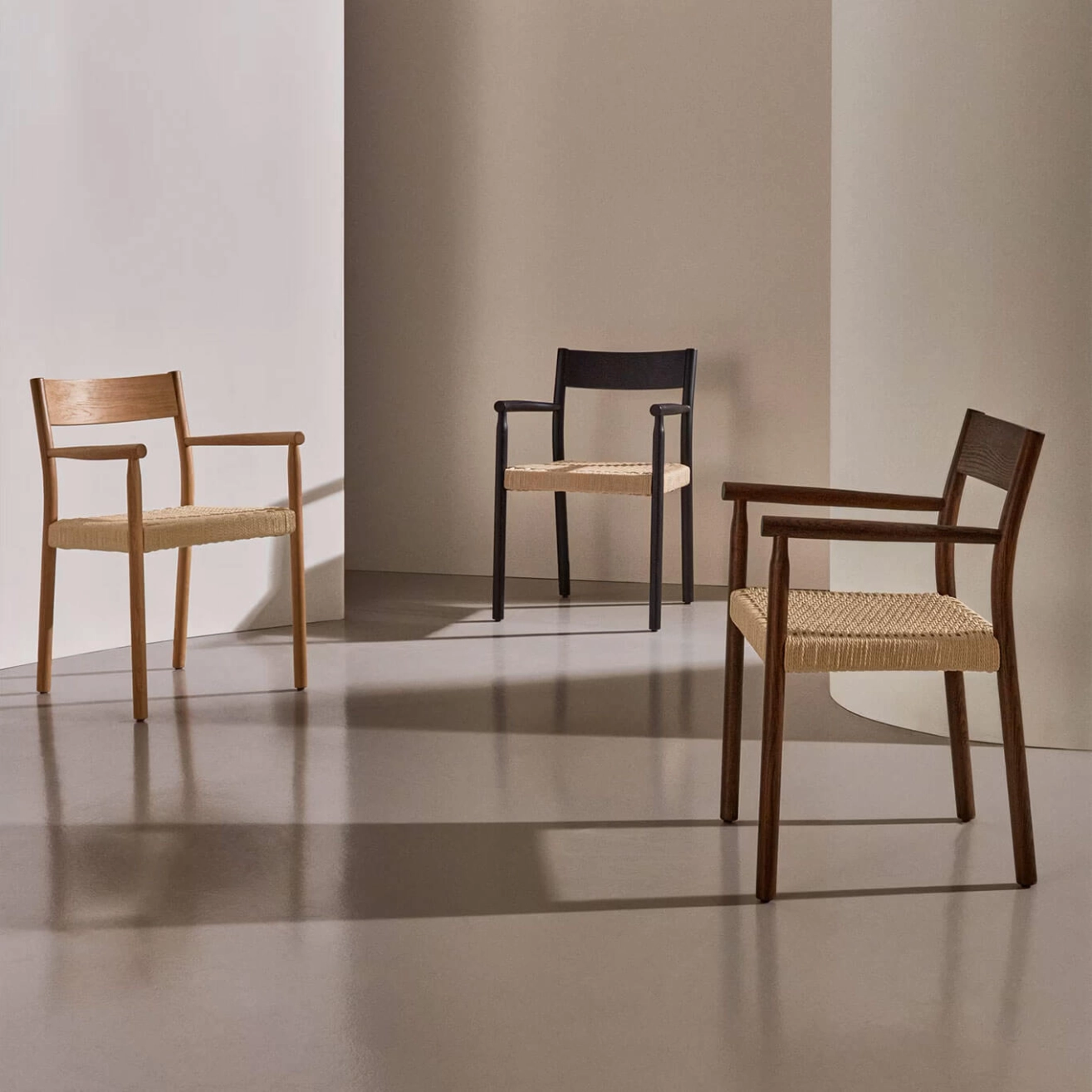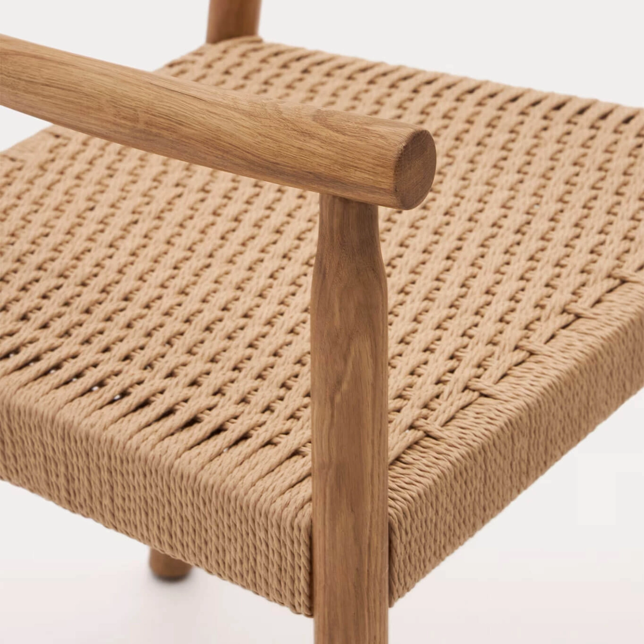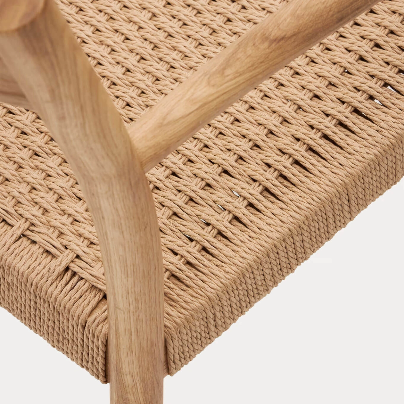 Yalia est une chaise en bois de chêne avec finition naturelle et siège en corde de papier tressée à la main, faisant partie de la collection