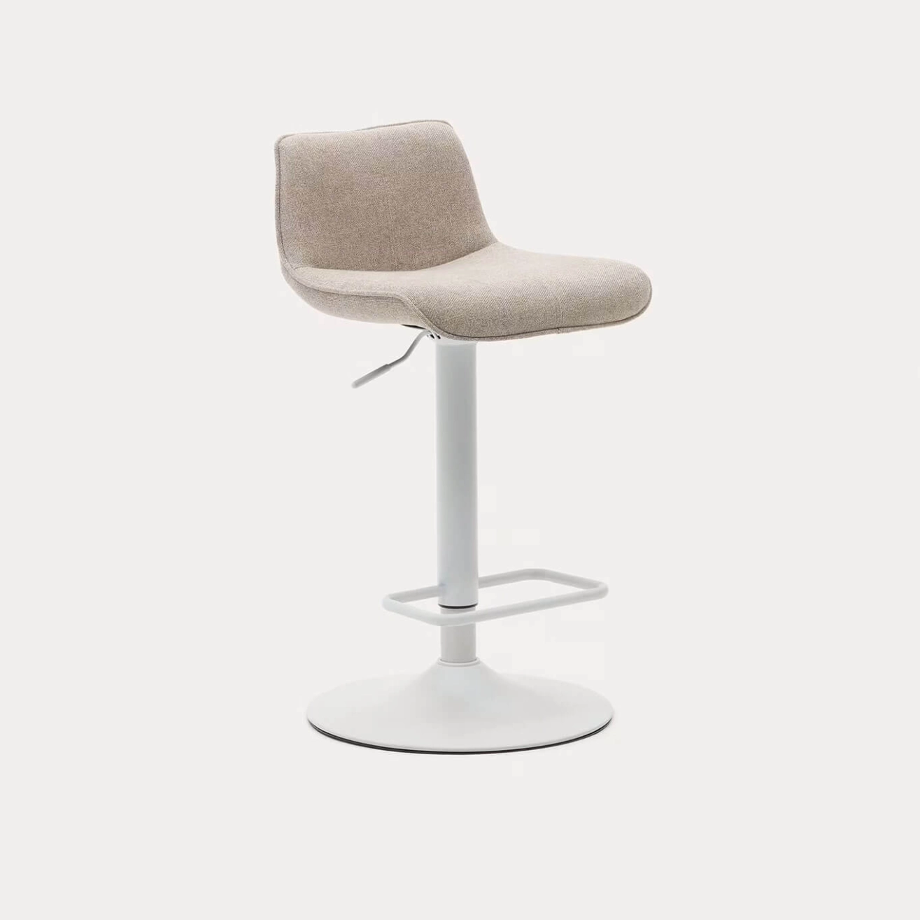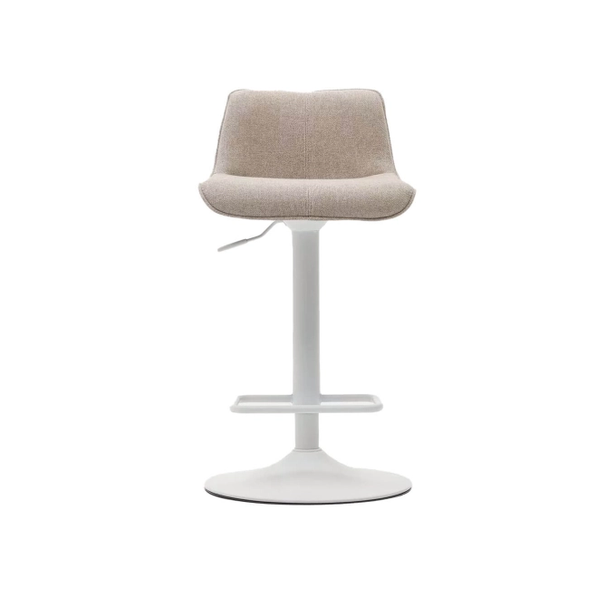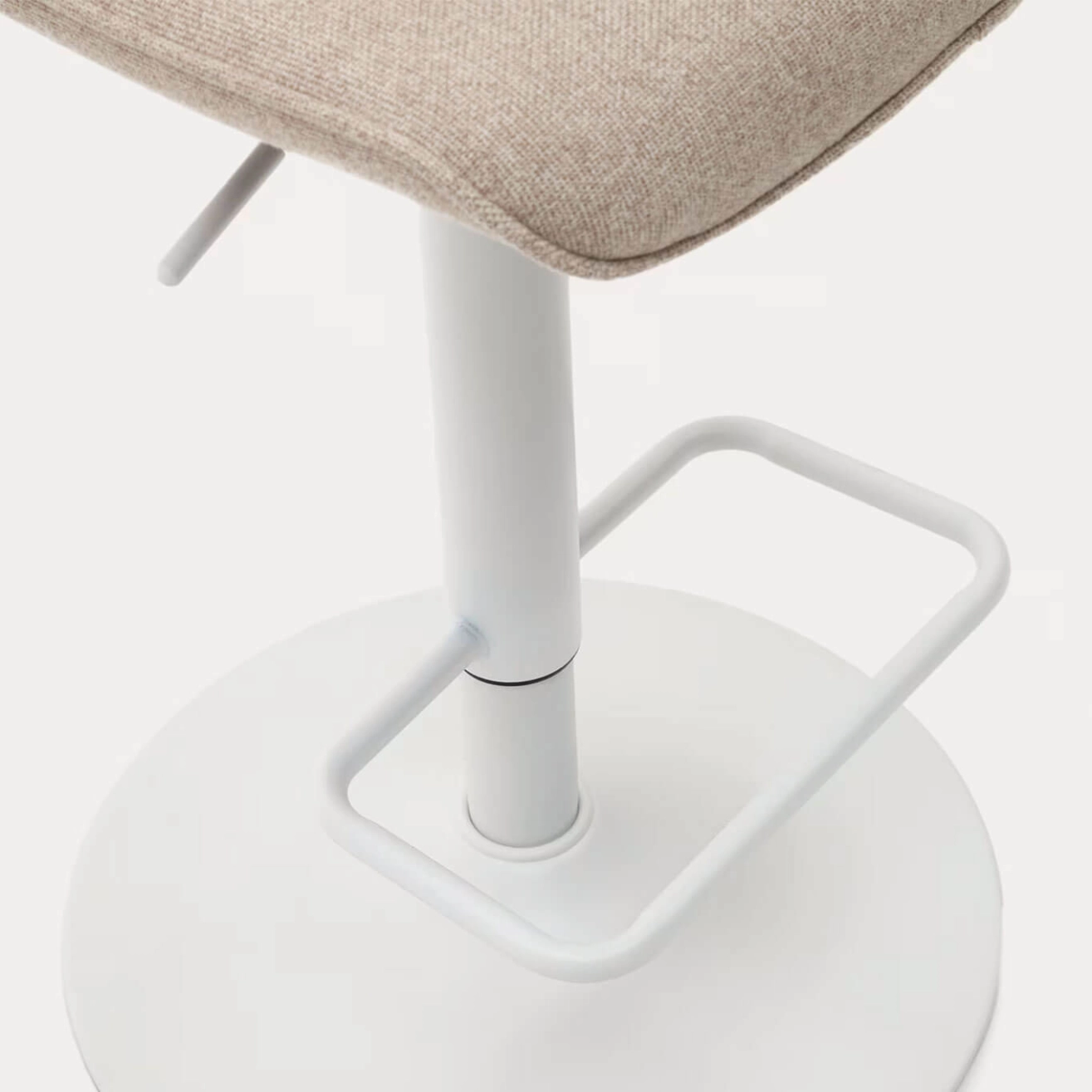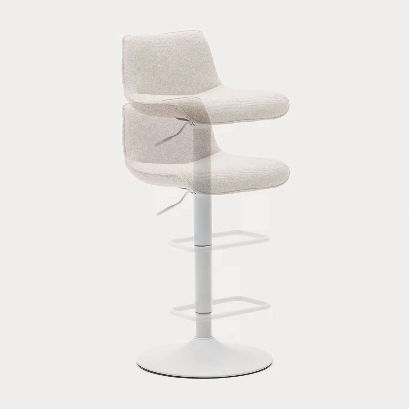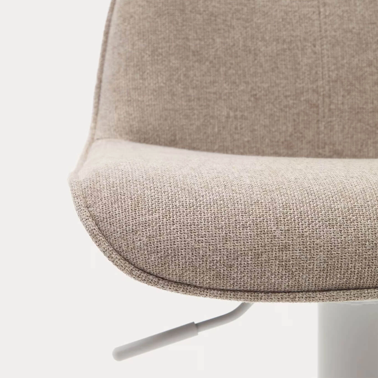 tabouret en tissu chenille beige avec structure en acier blanc mat et hauteur réglable de 81 à 102 cm, conçu par