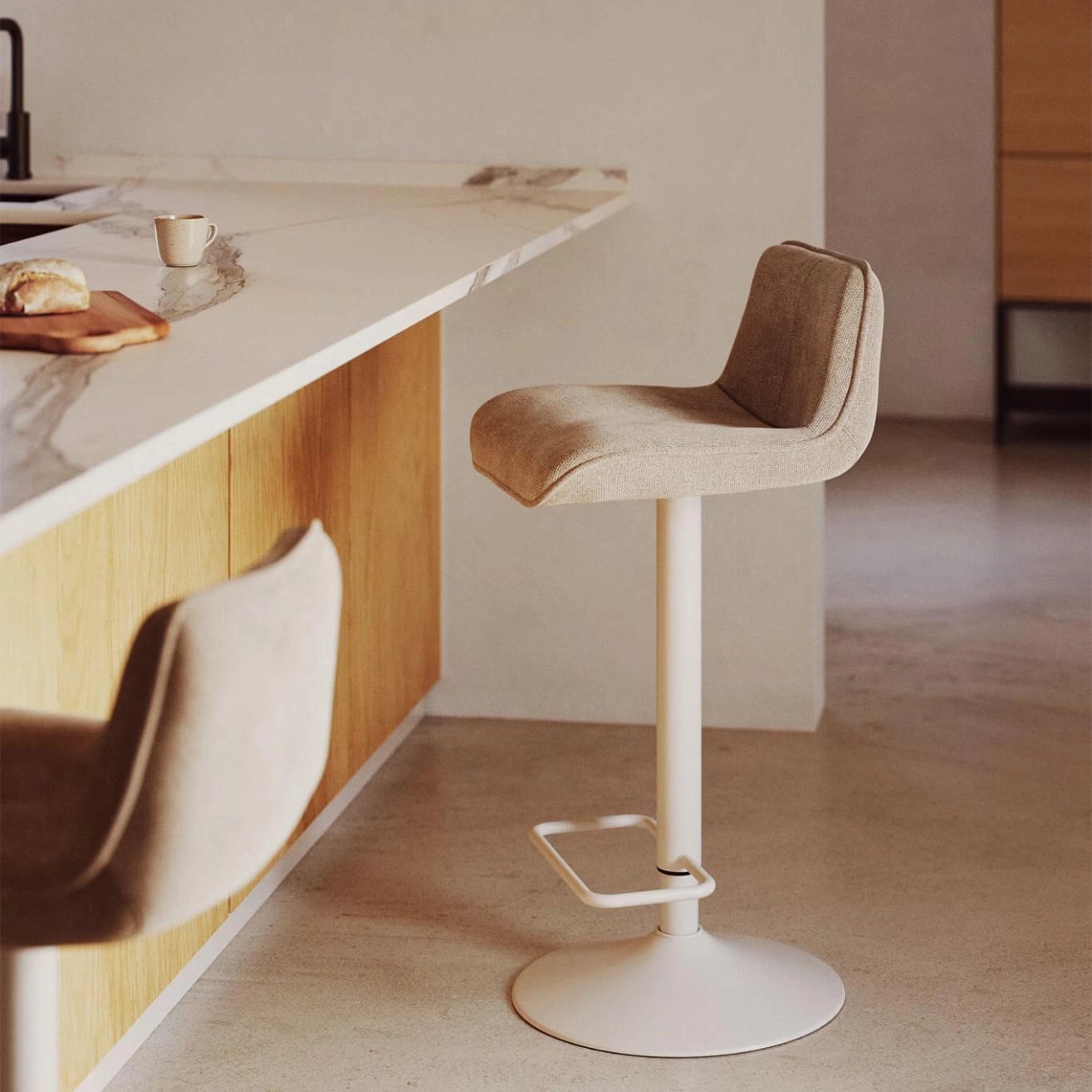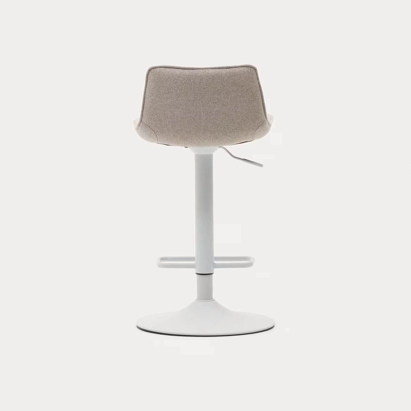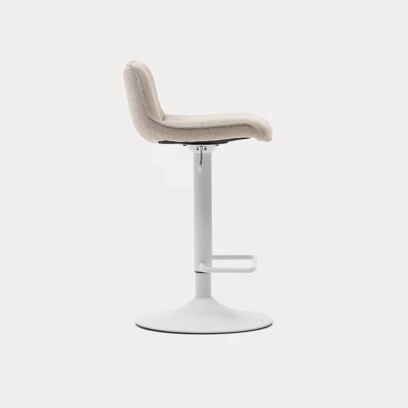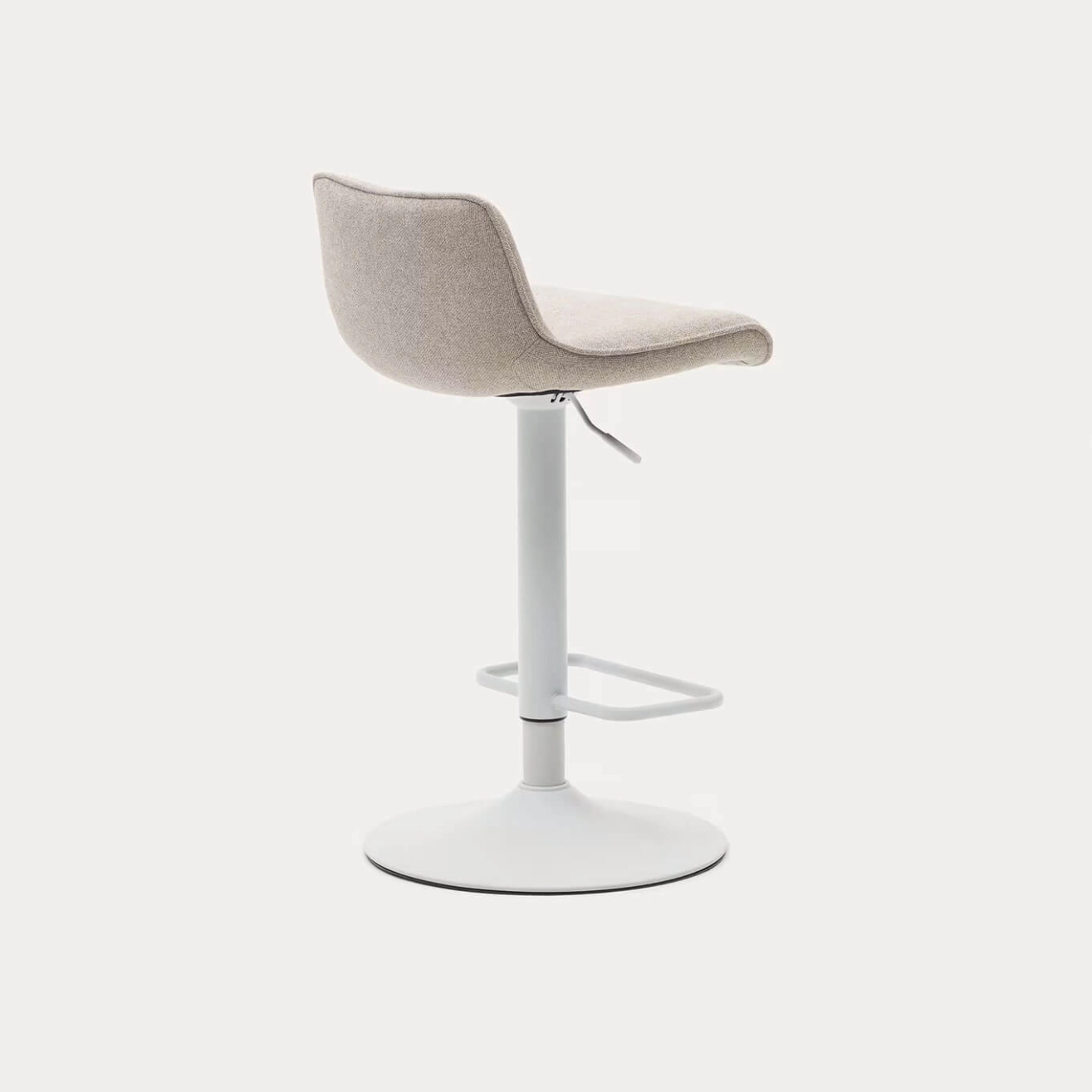 tabouret en tissu chenille beige avec structure en acier blanc mat et hauteur réglable de 81 à 102 cm, conçu par