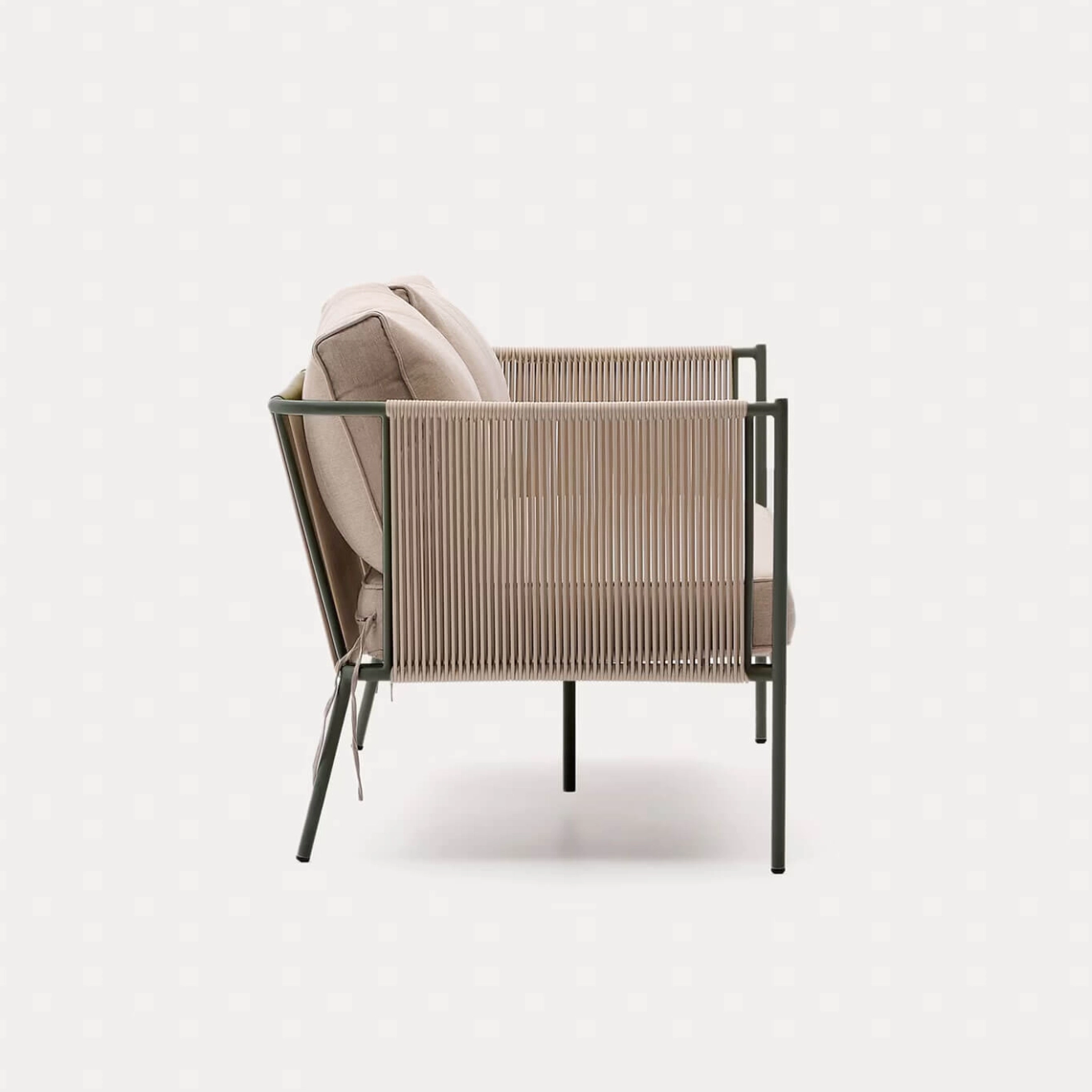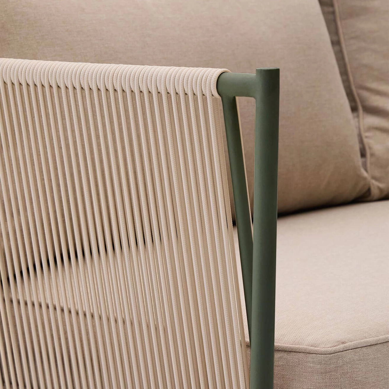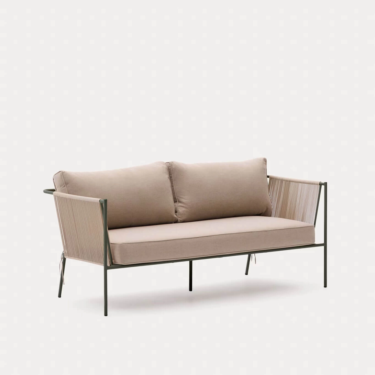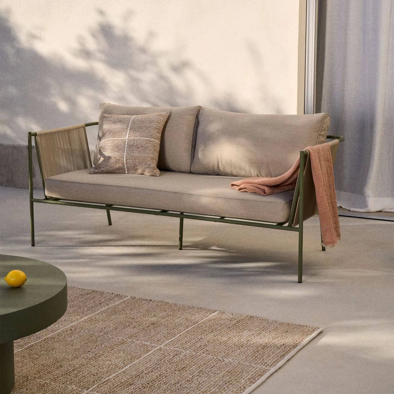 Zivia est un canapé 2 places d’extérieur en corde écrue et acier galvanisé vert, faisant partie de la collection