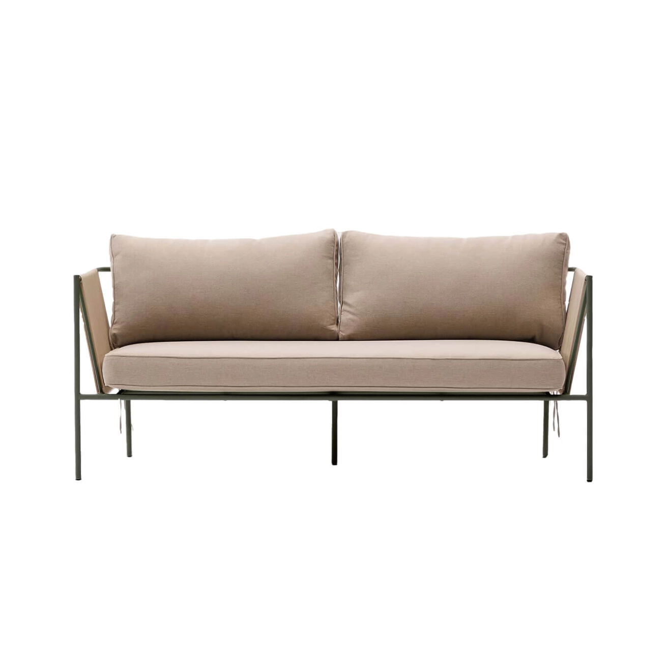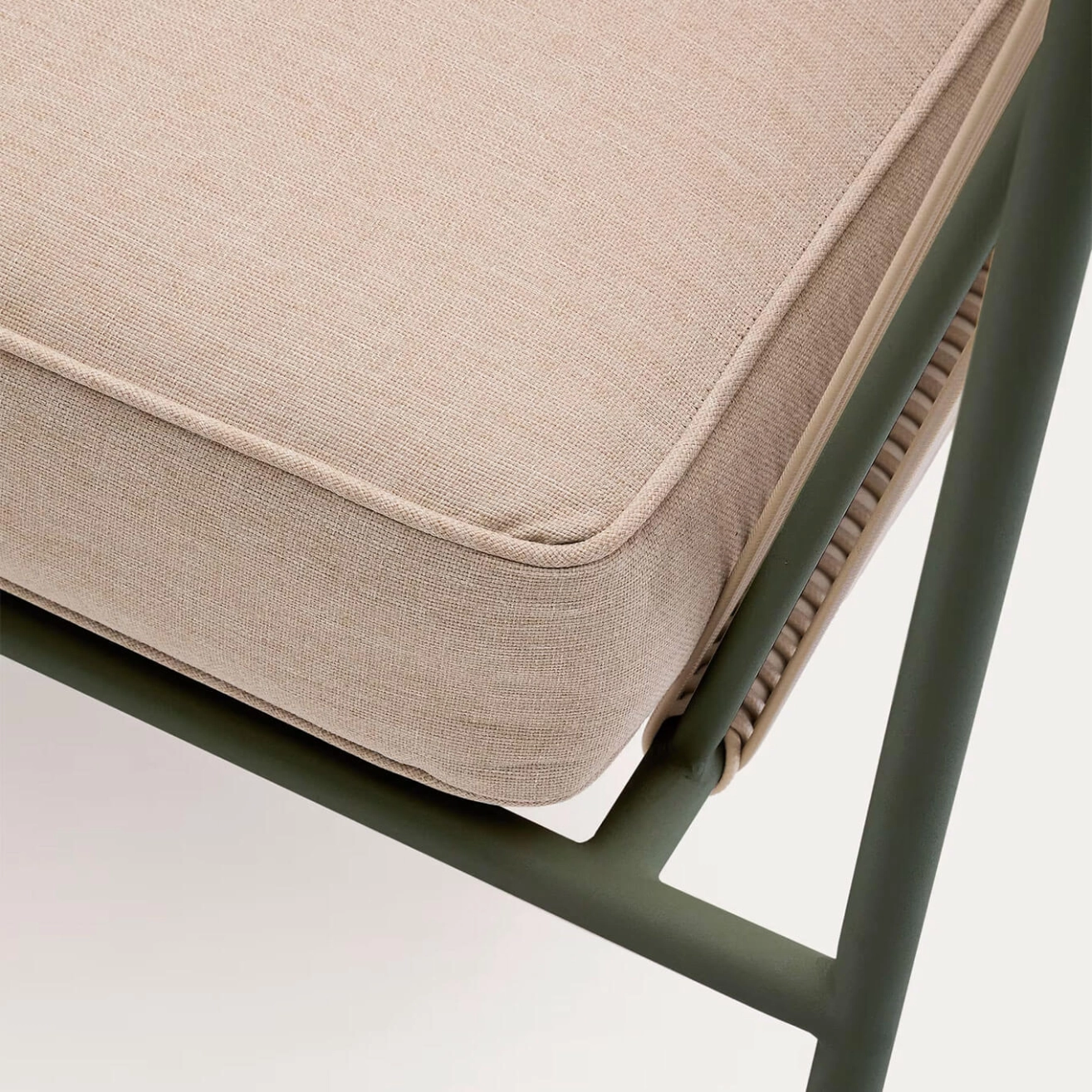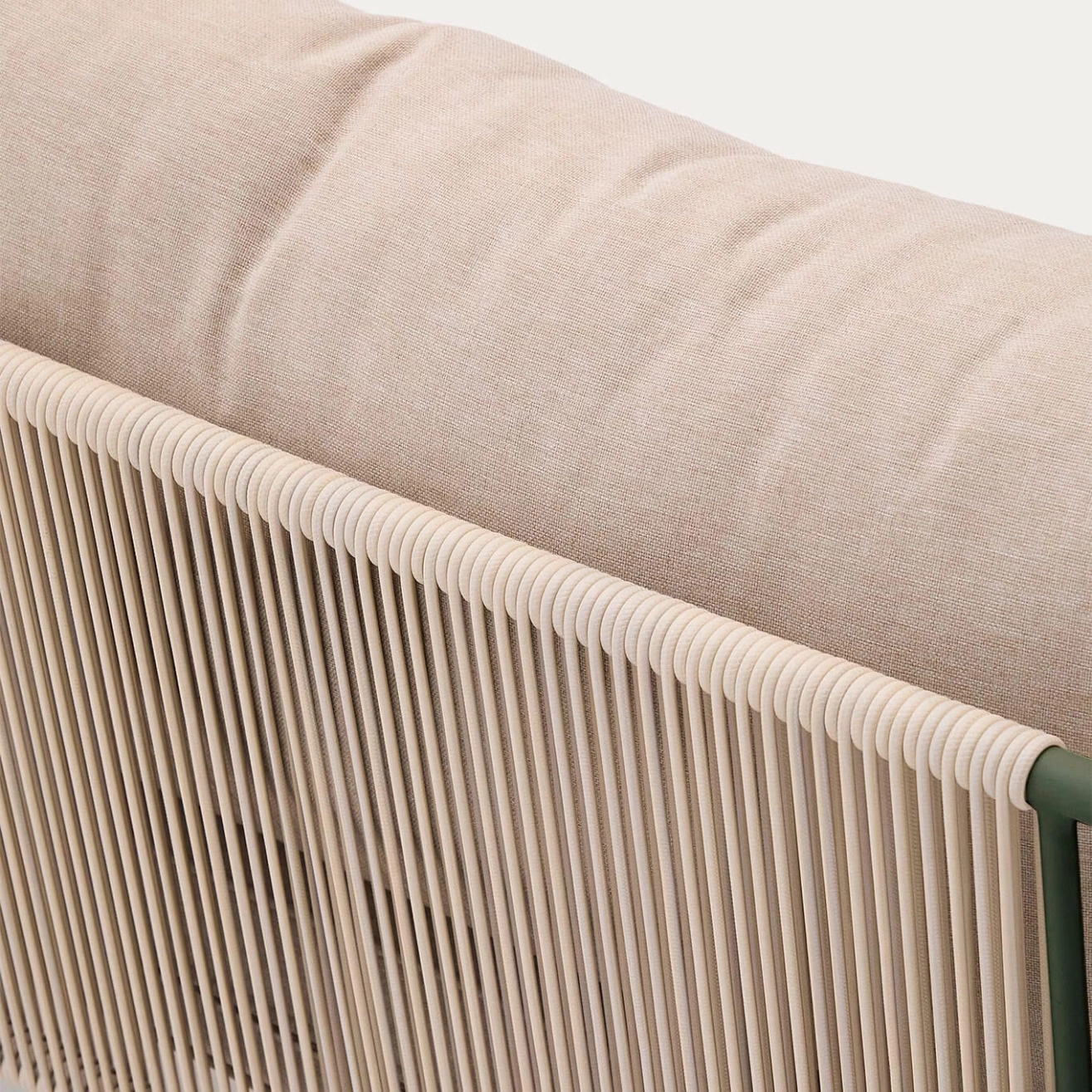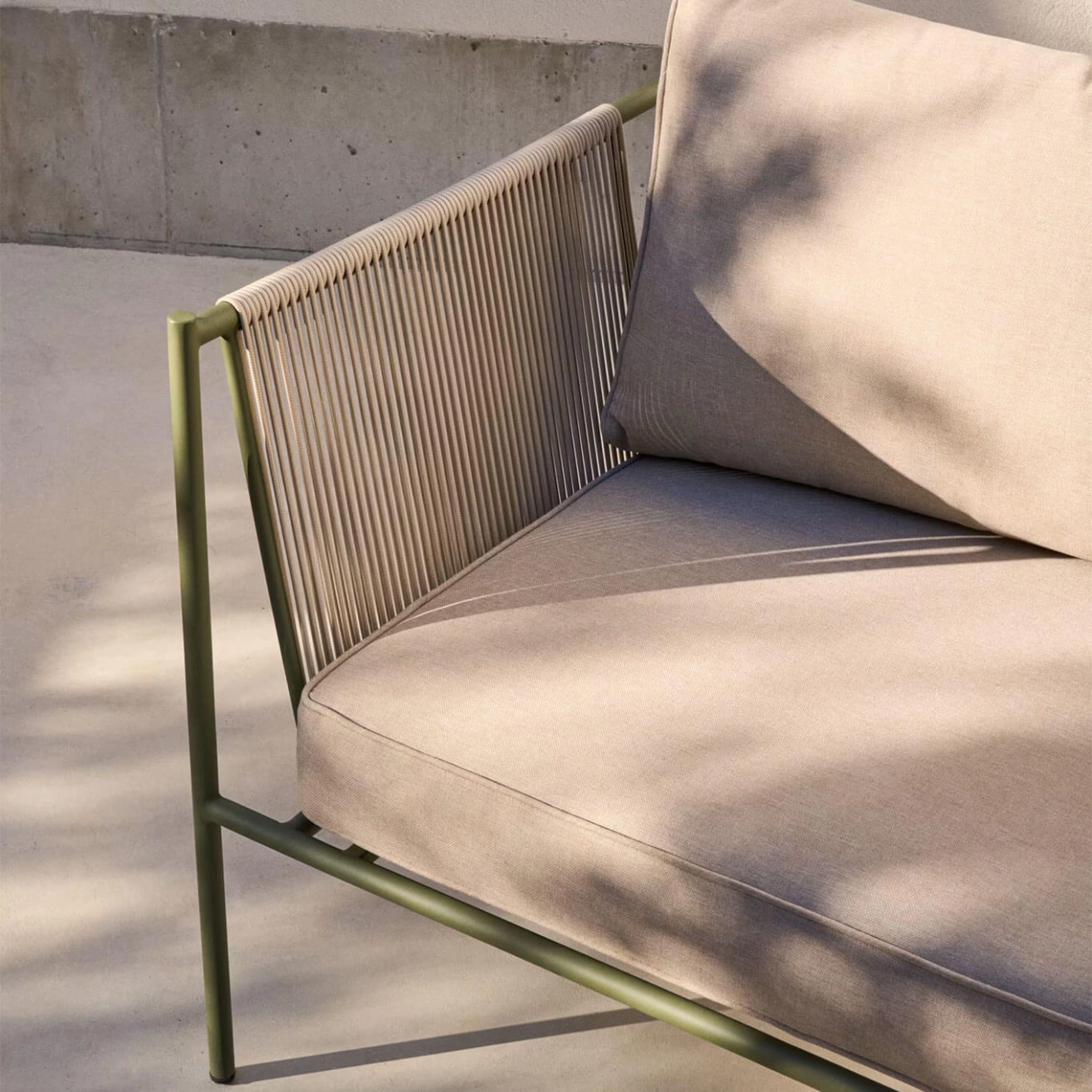 Zivia est un canapé 2 places d’extérieur en corde écrue et acier galvanisé vert, faisant partie de la collection