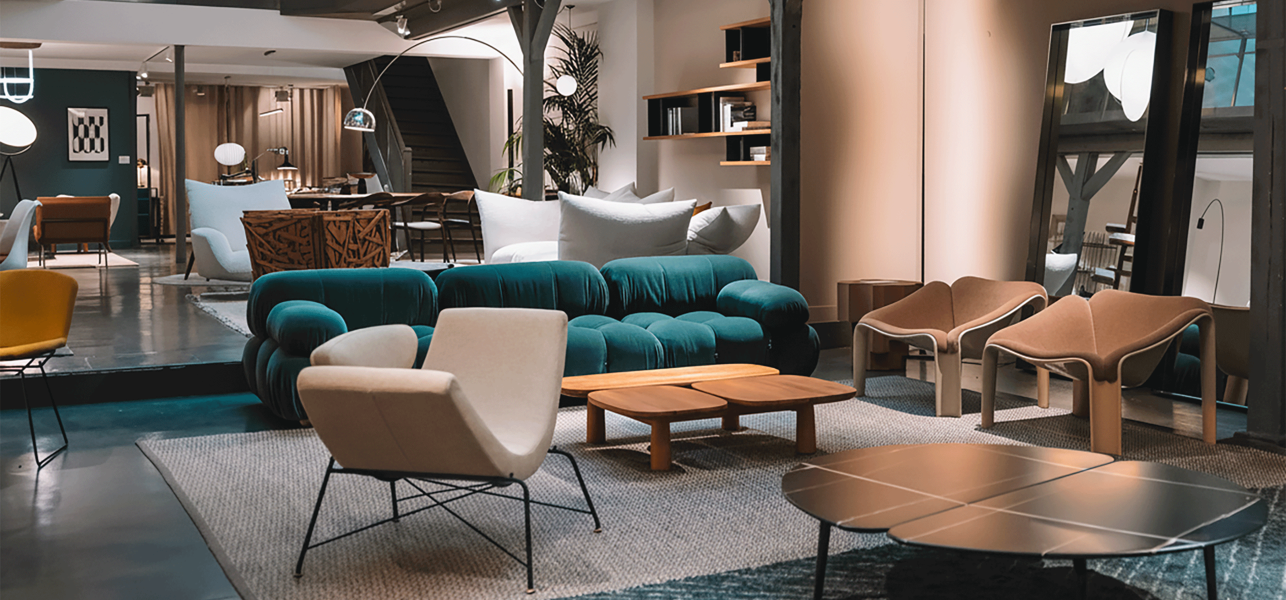 classiques du design, mises en valeur par des jeux graphiques de murs peints de différentes couleurs. Au 1er étage, en plus de l’offre multi marque, deux espaces sont dédiés aux marques : l’un à l’éditeur Vitra et l’autre à la marque outdoor Dedon.