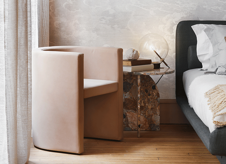 À l’étage, GUBI présente la chaise F300 et la table T877 de Pierre Paulin. La réédition du fauteuil F300 Lounge Chair marque le retour en production d’un second chef-d’œuvre du designer, accompagné de sa compagne naturelle : la table d’appoint T877.